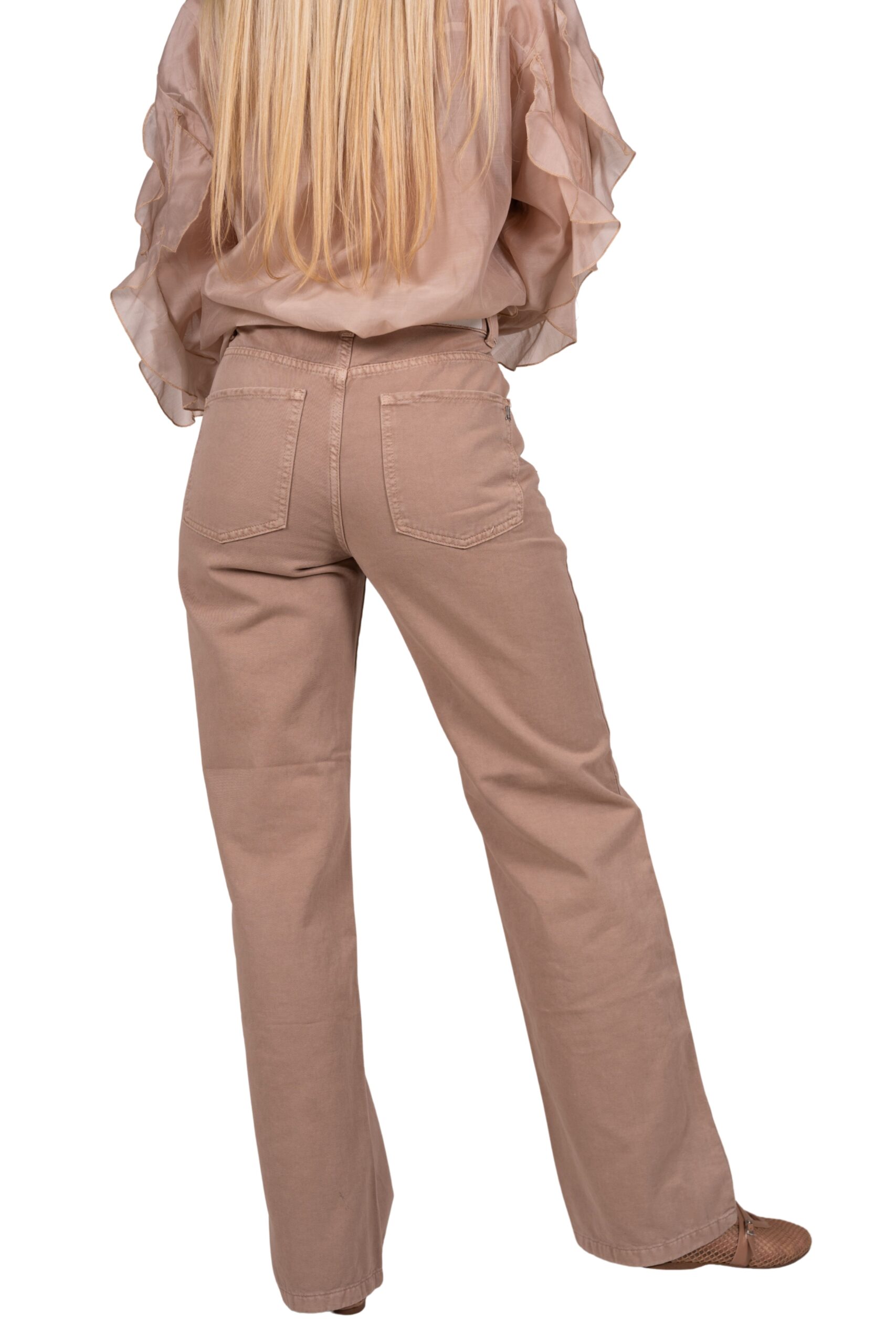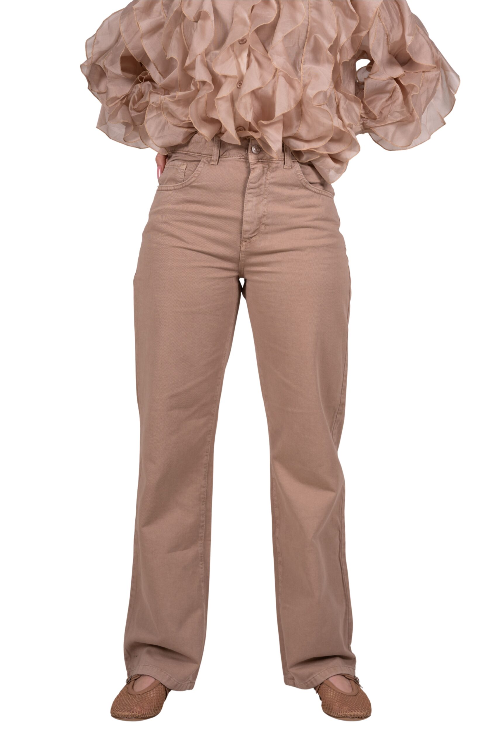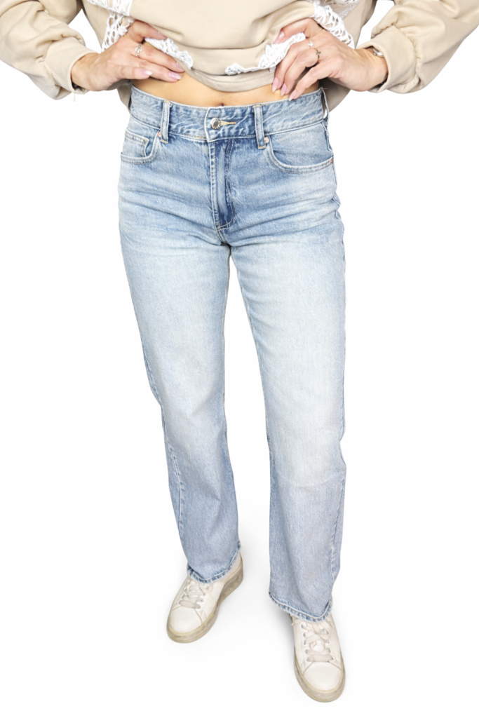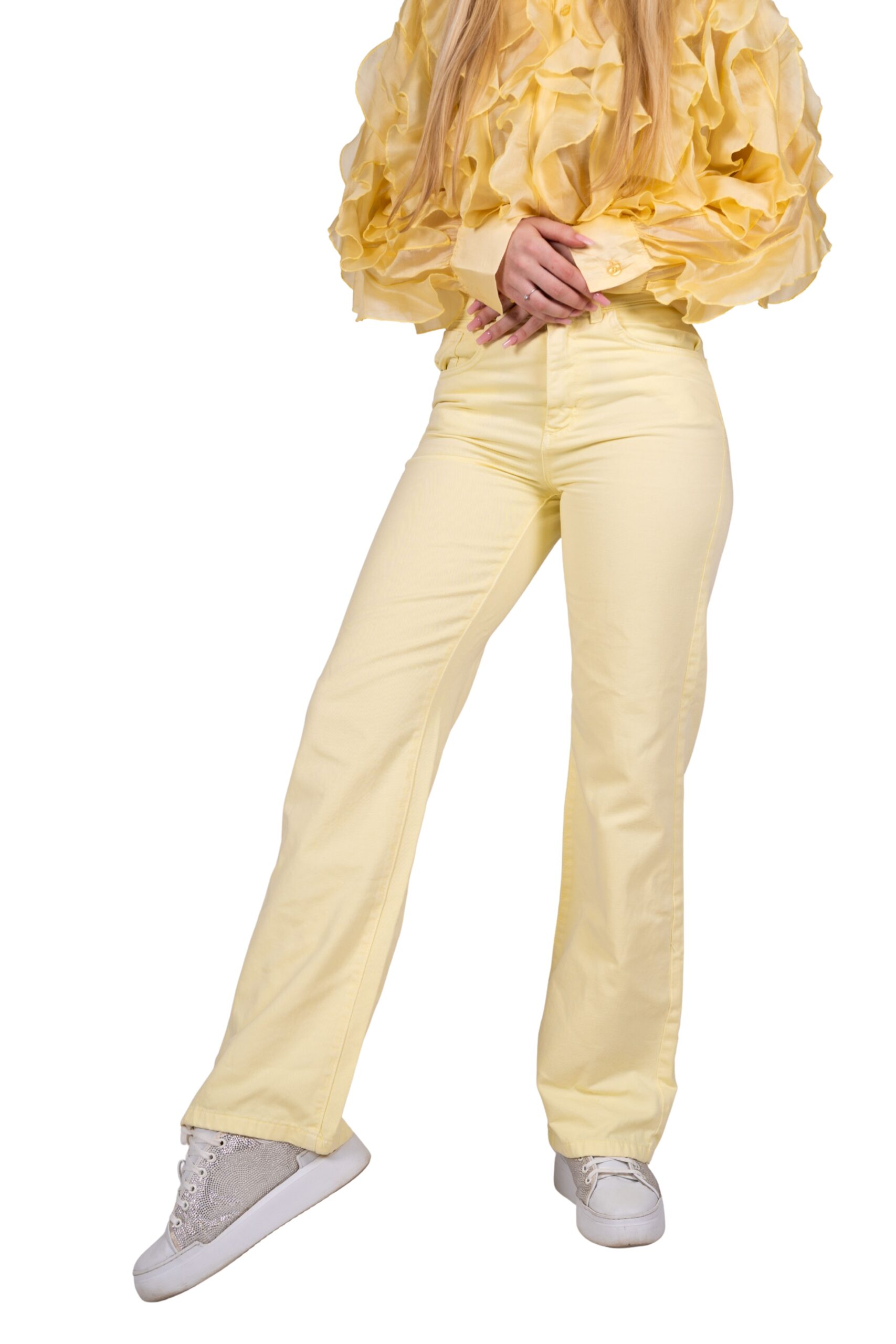 Stylové dámské džíny s rovnými nohavicemi a vysokým pasem v jemném pastelovém odstínu. Pohodlný střih s klasickým zapínáním na zip a knoflík krásně zvýrazní postavu a zároveň zajistí komfort při nošení. Džíny jsou vyrobené z kvalitního bavlněného materiálu, který si zachová tvar.