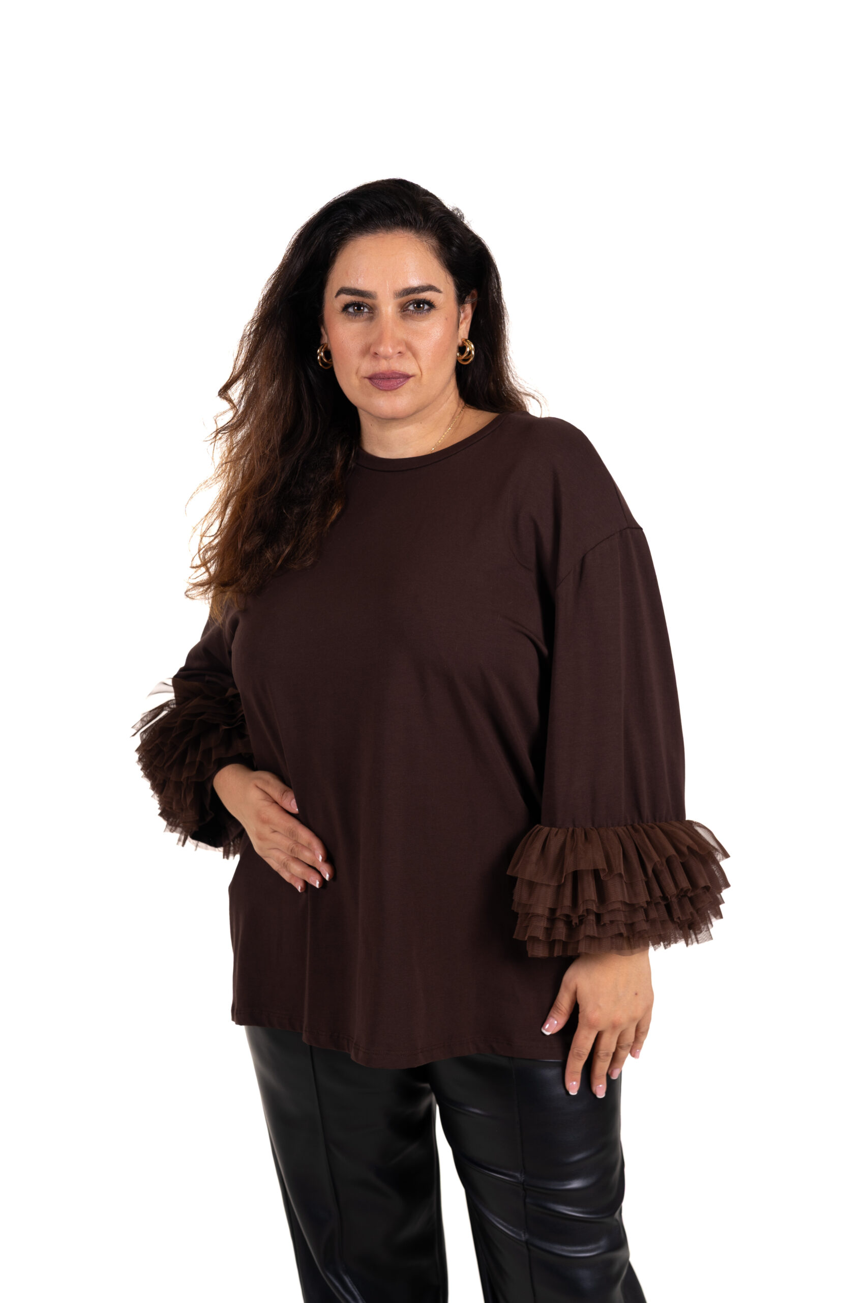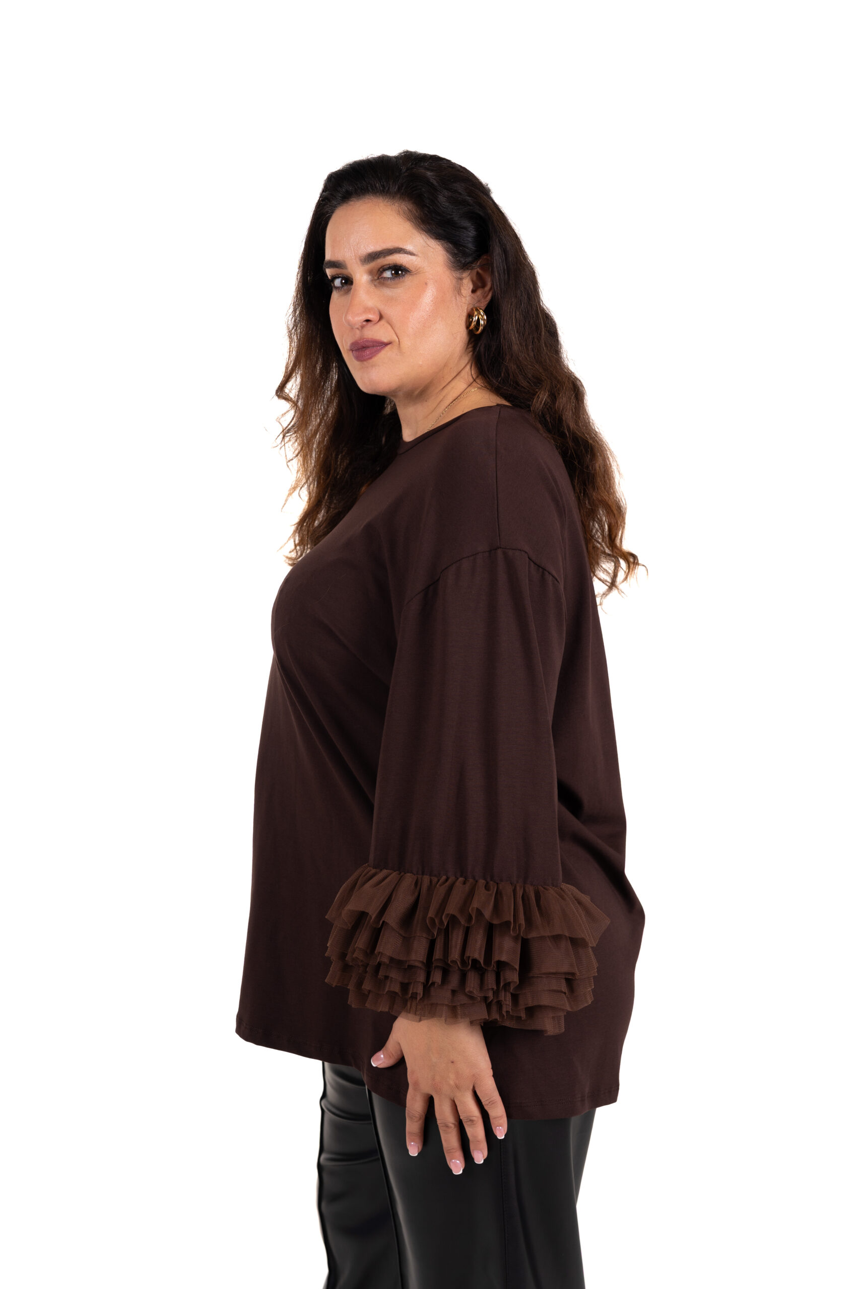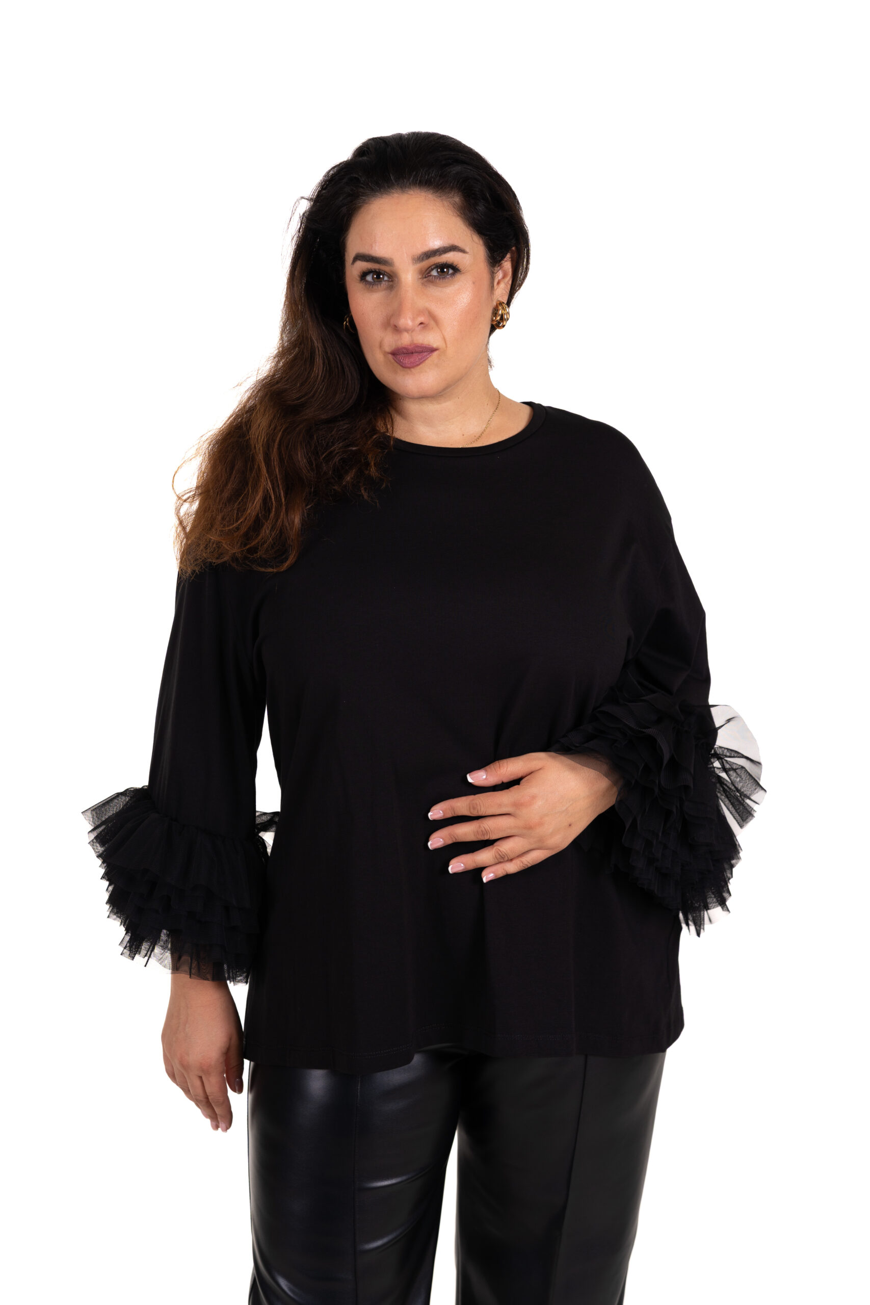 Tato maxi halenka zaujme na první pohled originálními rukávy zdobenými několika řadami volánů. Volný a pohodlný střih skvěle padne a snadno se kombinuje s kalhotami, džínami a sukní. Ideální volba pro ženy, které chtějí propojit každodenní komfort s výrazným detailem.