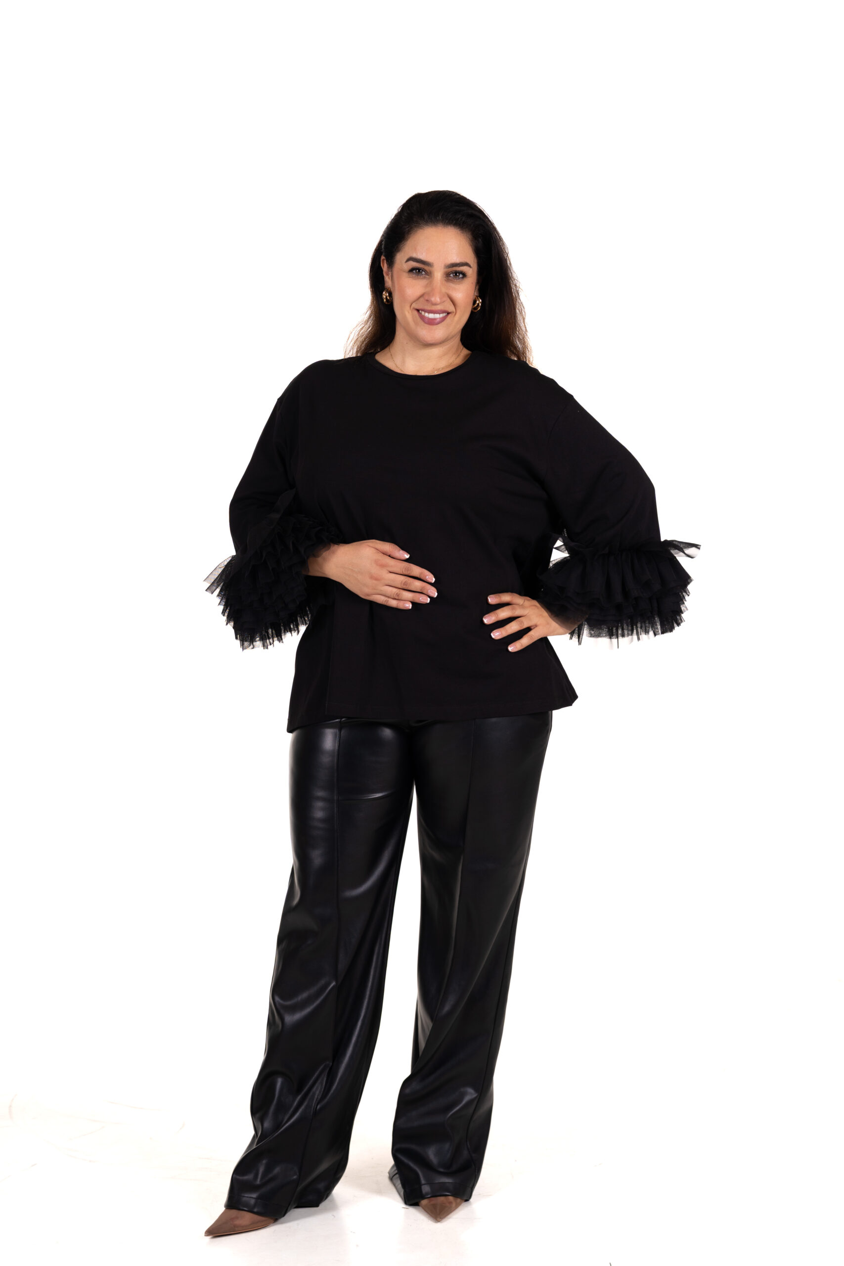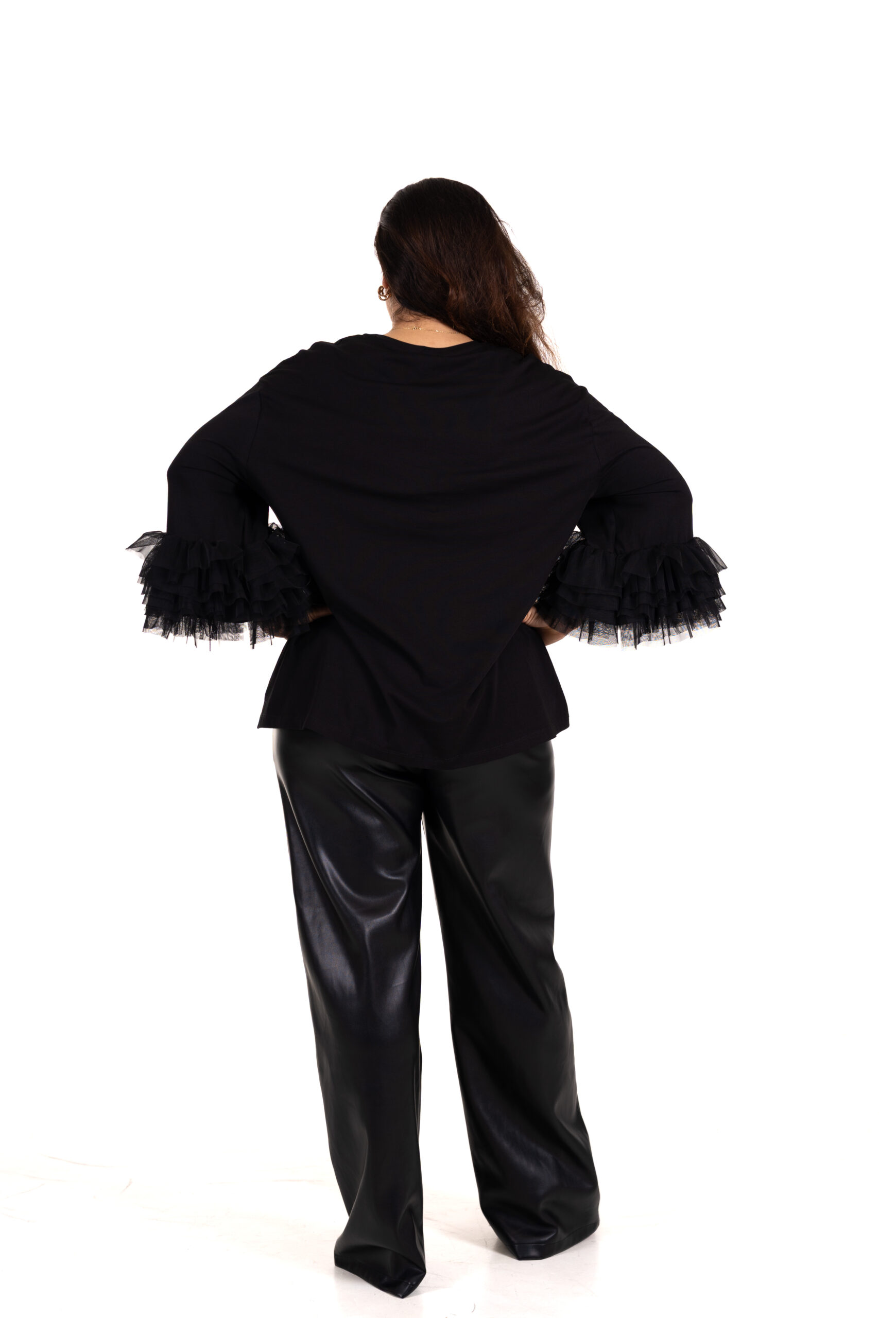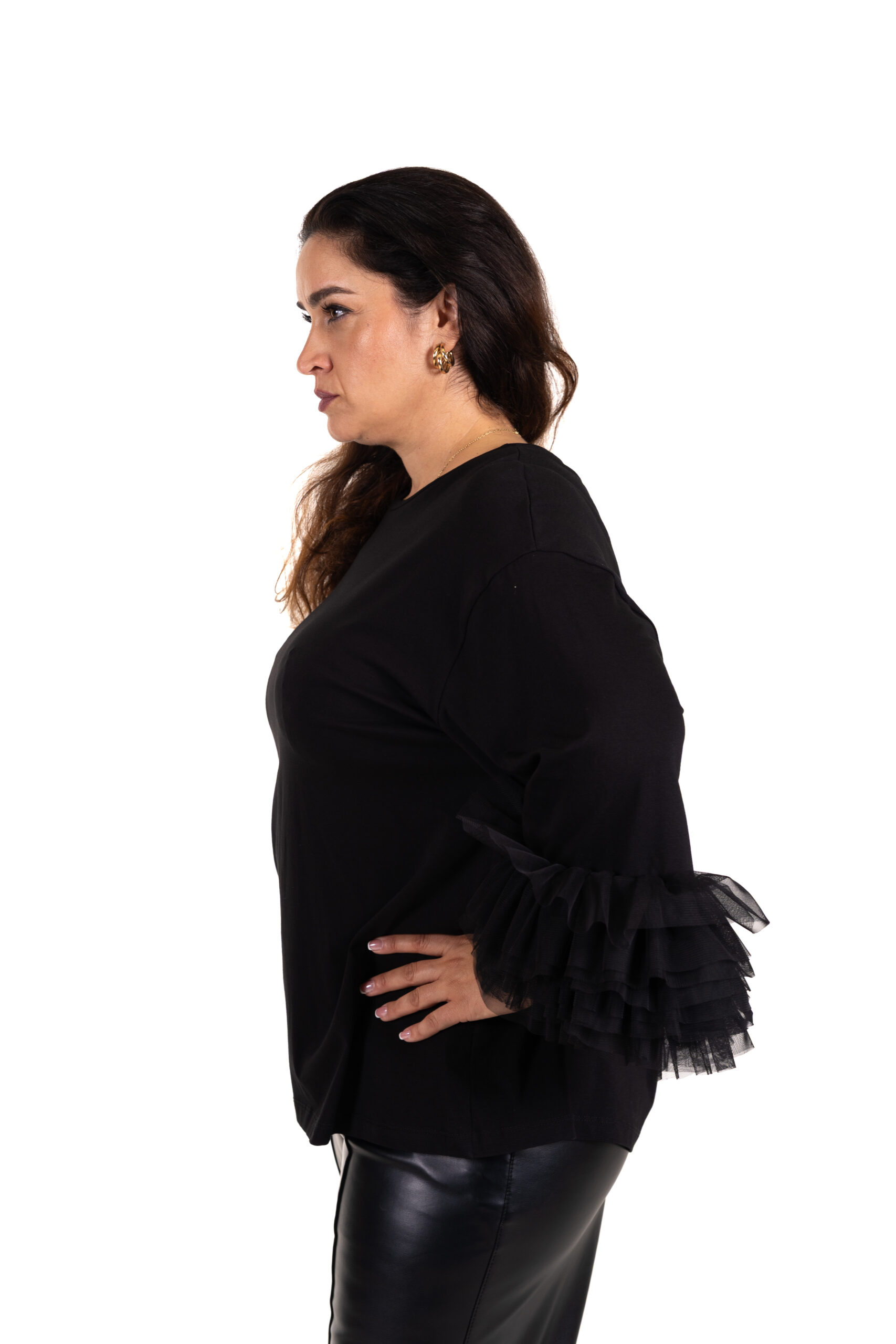 Tato maxi halenka zaujme na první pohled originálními rukávy zdobenými několika řadami volánů. Volný a pohodlný střih skvěle padne a snadno se kombinuje s kalhotami, džínami a sukní. Ideální volba pro ženy, které chtějí propojit každodenní komfort s výrazným detailem.