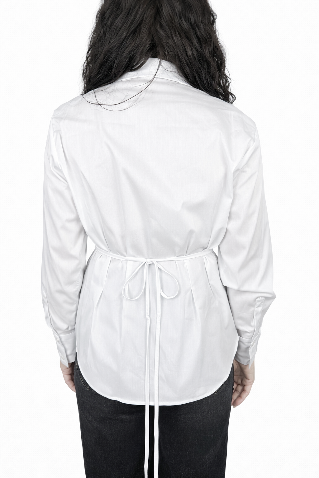 Bílá vypasovaná košile s možností stažení šňůrkou pro dokonalé přizpůsobení postavě. Šňůrku lze zavázat vpředu i vzadu, takže si střih upravíš podle nálady i outfitu. Košile má jemné vycpávky, které krásně tvarují ramena.