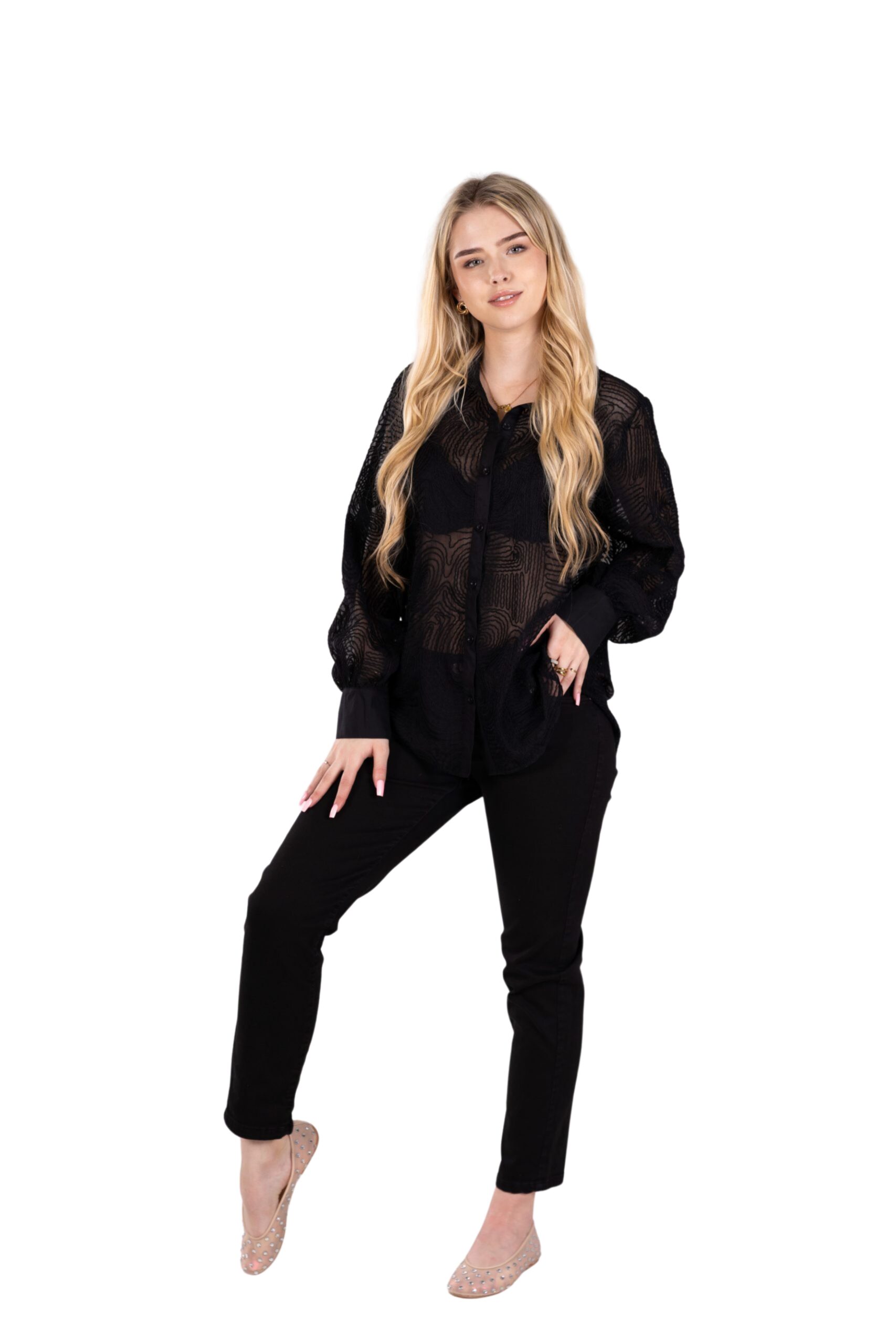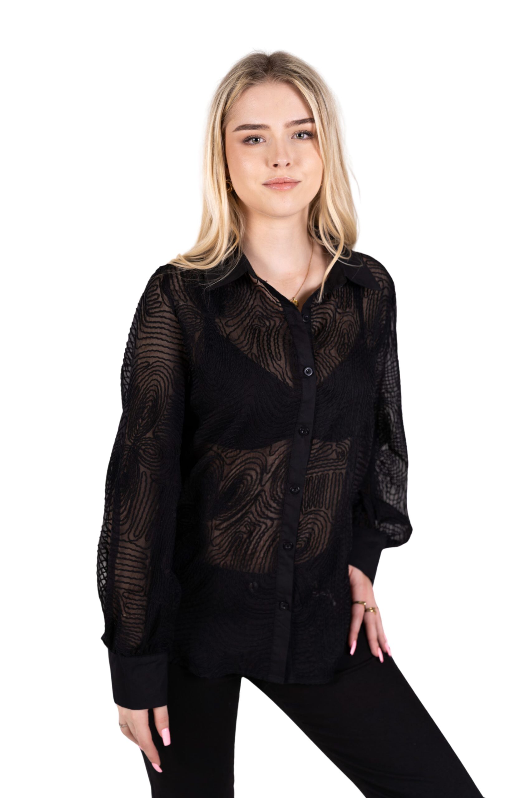 Stylová černá košile z lehce průsvitného materiálu s originálním reliéfním vzorem. Má klasické zapínání na knoflíky, volnější střih a dlouhé rukávy zakončené manžetou. Elegantní kousek, který vynikne jak v kombinaci s kalhotami, tak se sukní.