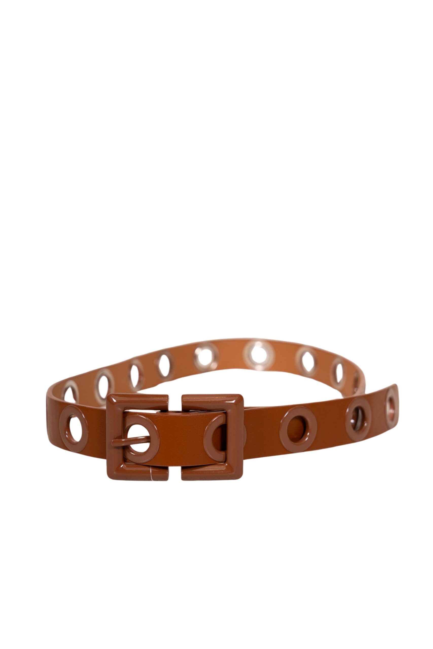 Stylový kožený pásek v odstínu camel s cvokovým zapínáním – ideální pro výrazní outfit.