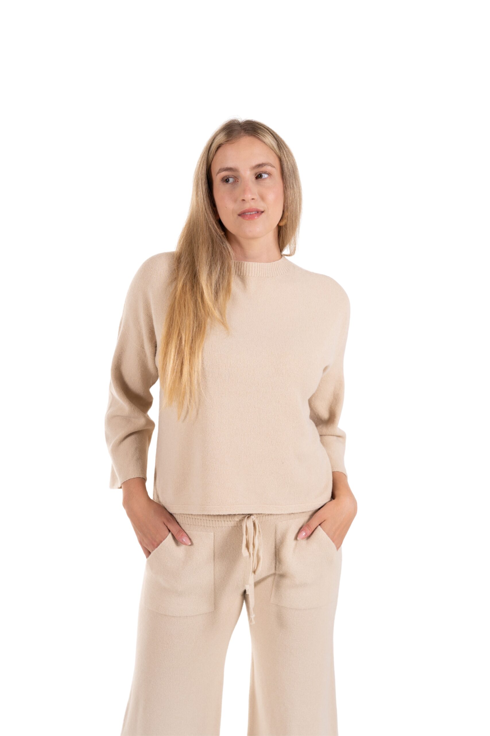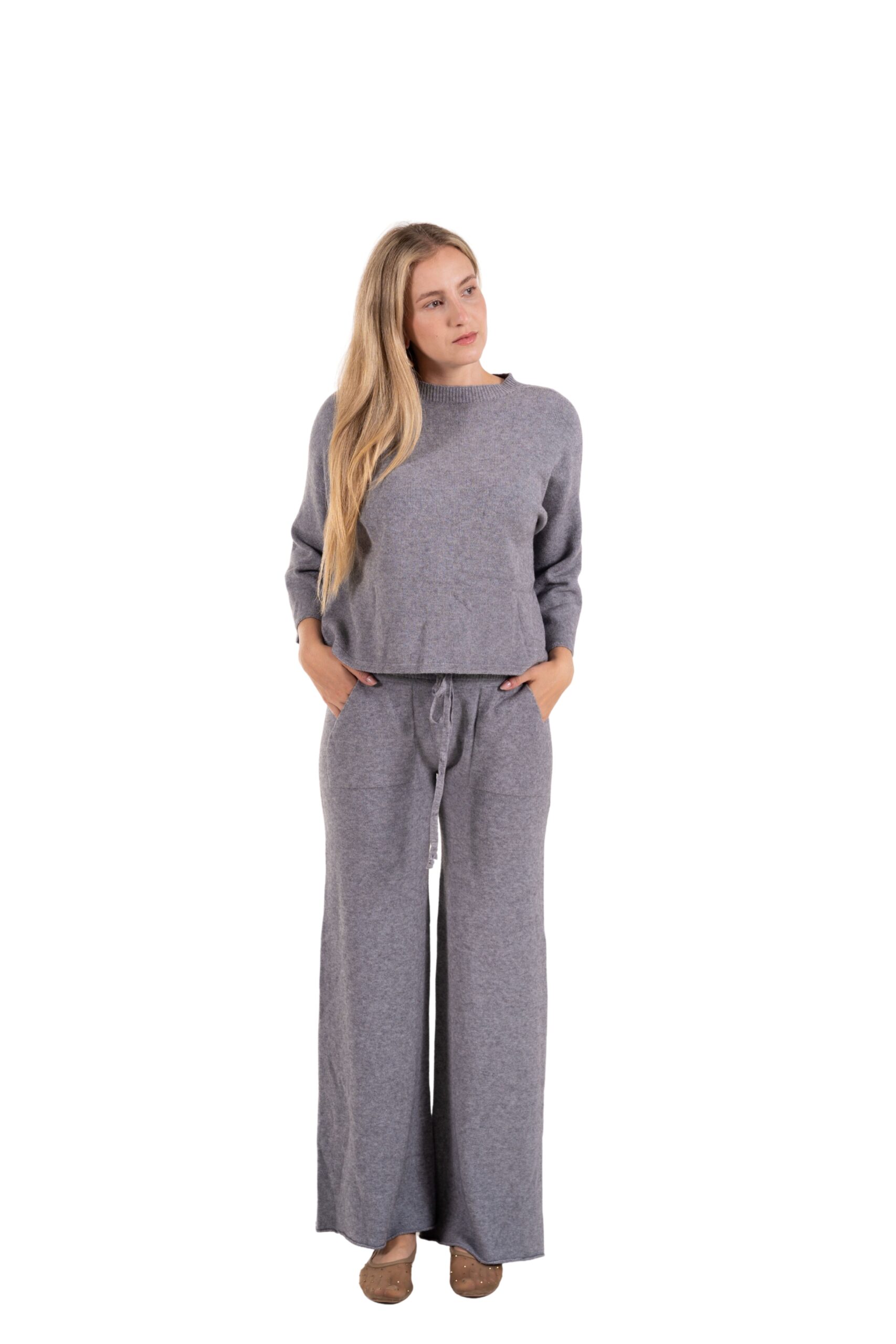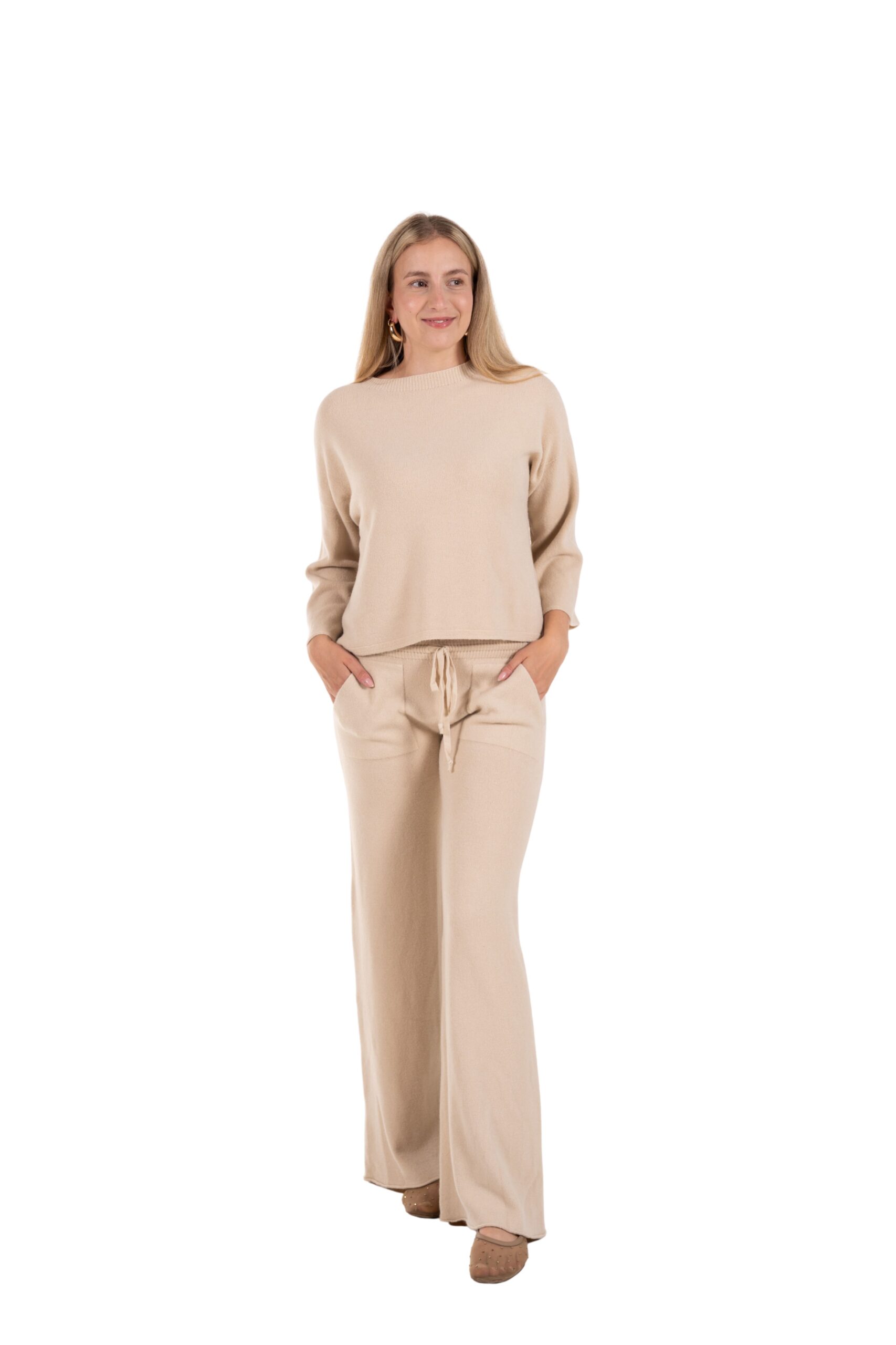 Objevte dokonalou kombinaci pohodlí a stylu s našim setem Soft Elegance. Tento dvoudílný outfit z jemného, příjemného materiálu vám poskytne pocit naprosté volnosti, ať už doma, na cestách nebo při volnočasových aktivitách. Lehká halenka s uvolněným střihem a široké kalhoty se stahovací šňůrkou krásně ladí dohromady a vytváří minimalistický, moderní vzhled. Na kalhotáh je i klokaní kapsa.
