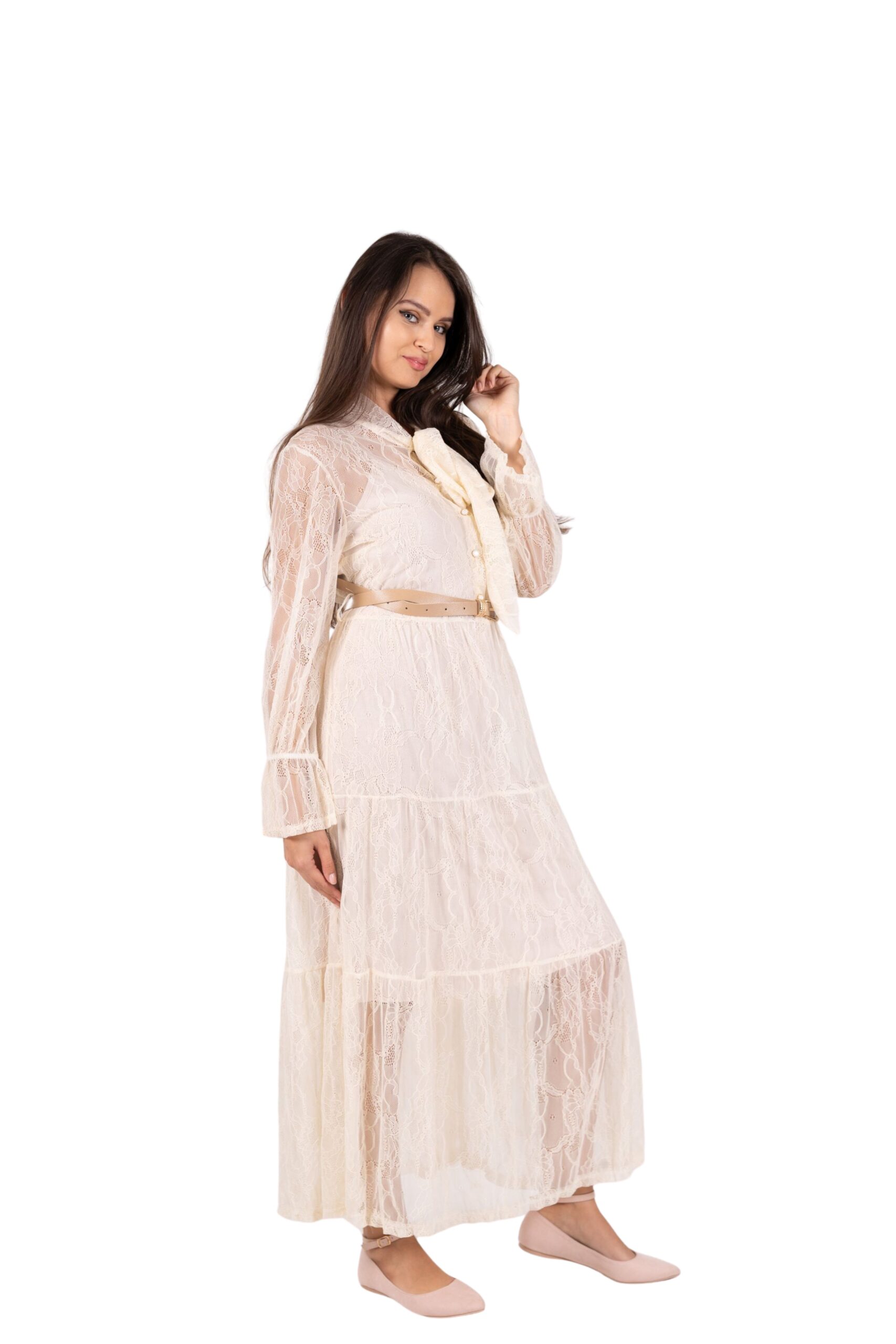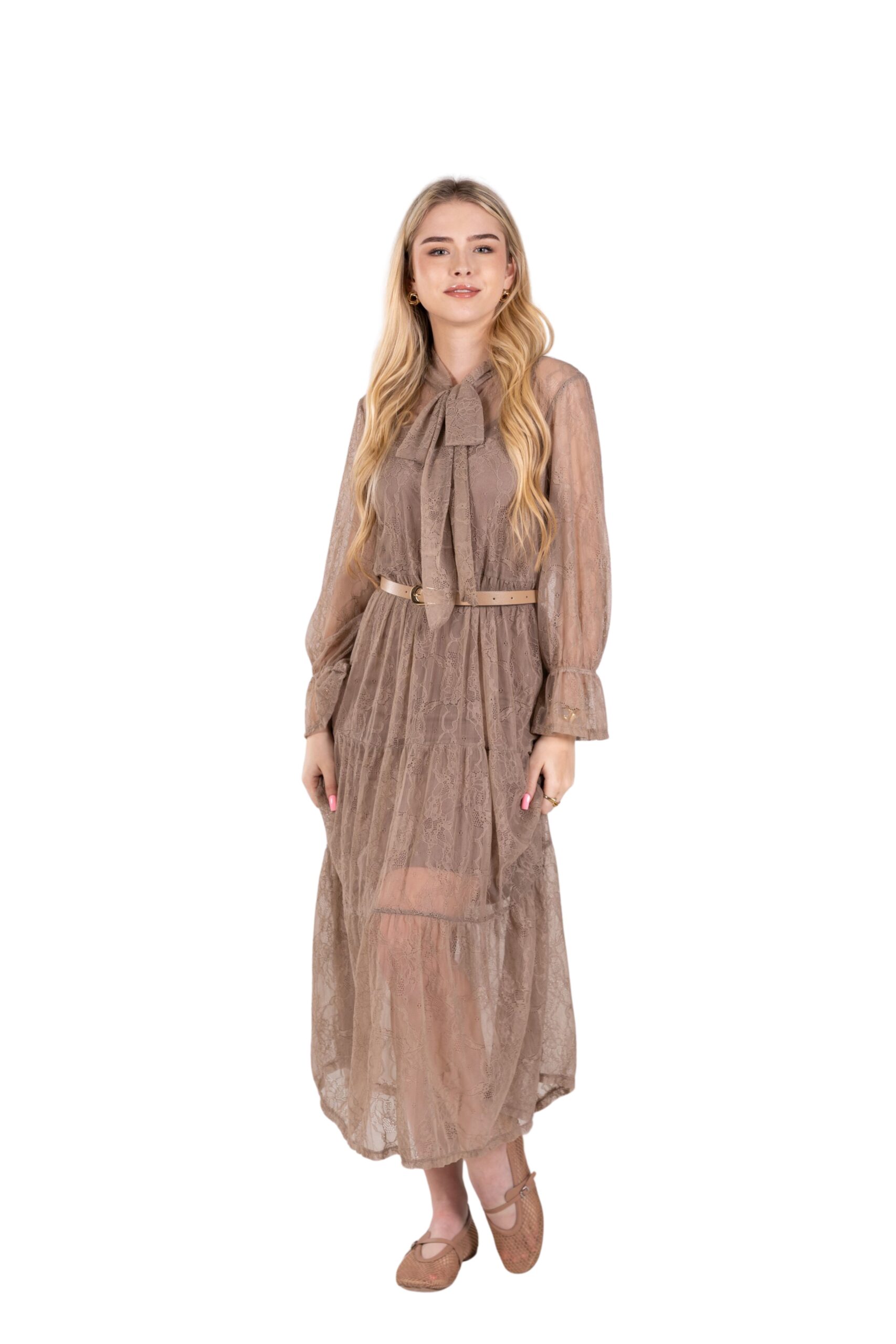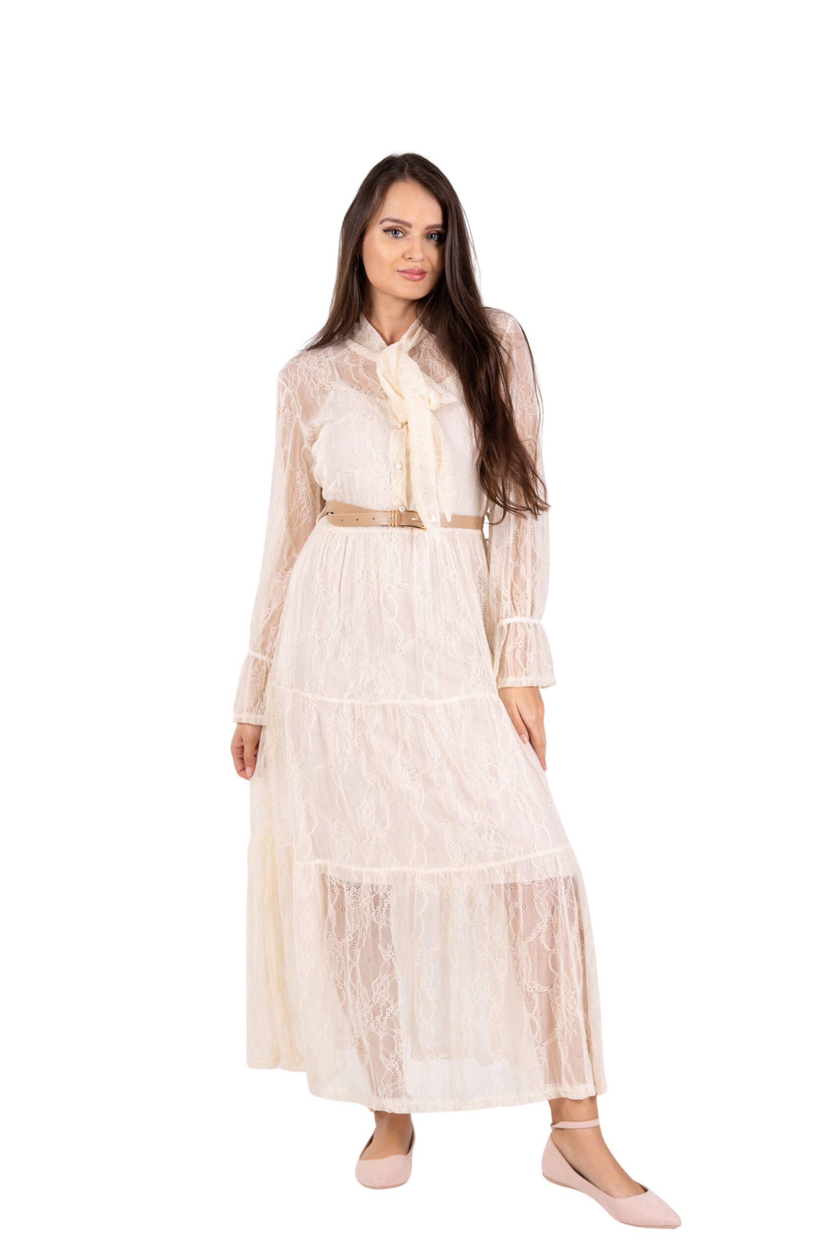 Elegantní a nadčasové. Tyto dlouhé krajkové šaty jsou ideální volbou pro společenské události, slavností příležitosti i romantické večery. Jsou vyrobené z jemné krajky s lehce elastickým efektem, díky čemuž krásně kopírují postavu a zároveň zůstávají pohodlné po celý den. Součástí je bavlněná spodnice, která zajišťuje neprůhlednost šatů. V pase najdete tenký pásek, který zvýrazní siluetu a dodá šatům ženský tvar.