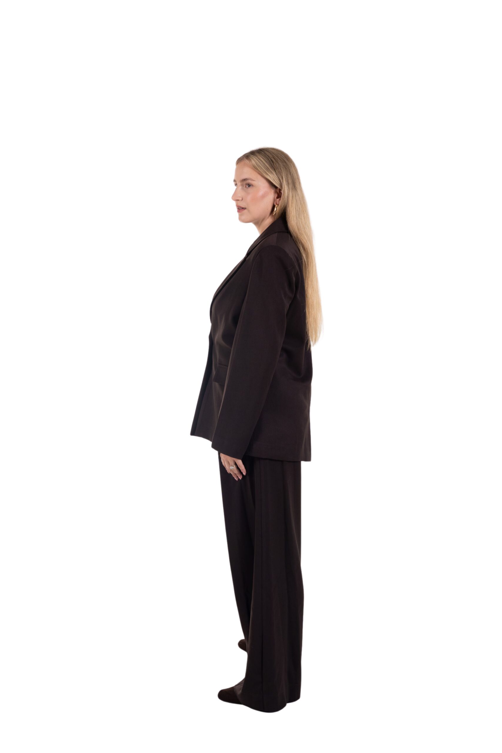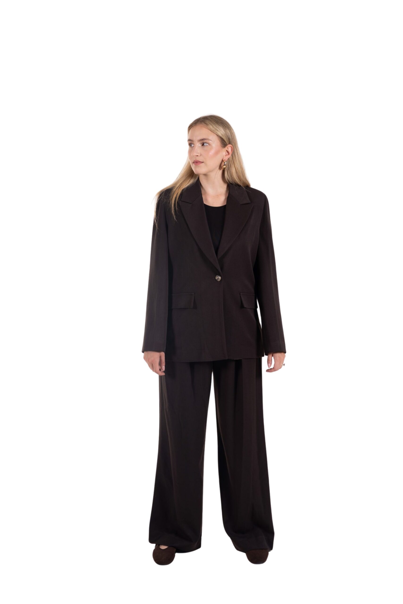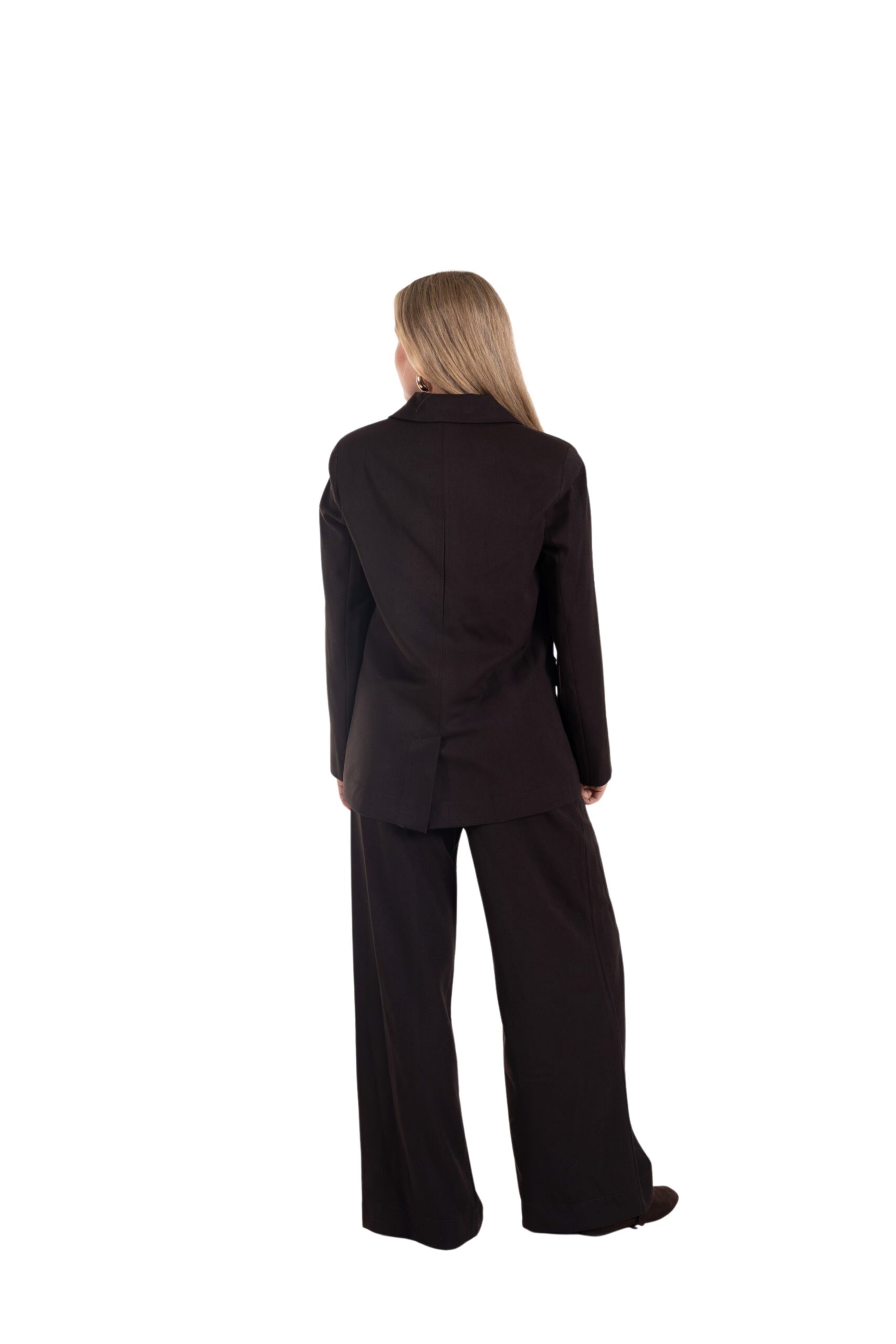 Elegantní kostým, který spojuje pohodlí a styl v jednom. Sako v jedním knoflíkem a decentním rozparkem vzadu působí nadčasově a dodává outfitu lehkost i eleganci. Široké volné kalhoty se postarají o maximální komfort a zároveň opticky prodlouží postavu.