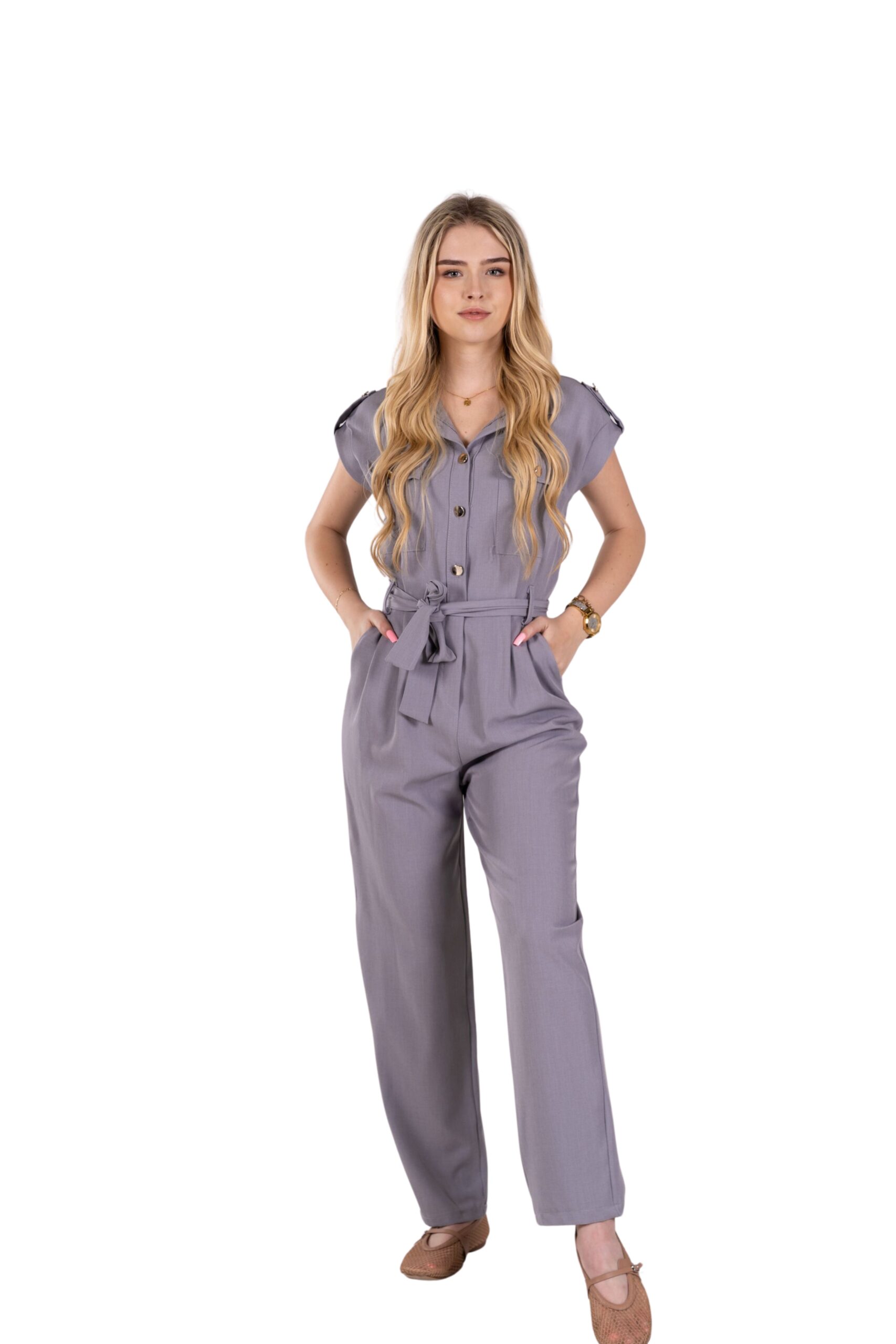 Tento lehce strukturovaný overal v jemně modrém odstínu kombinuje styl a komfort – ideální pro každodenní nošení. Má košilový límeček, knoflíky po celé délce a krátké rukávy s ozdobným poutkem. V pase je guma na zadní části a pásek ze stejného materiálu, který zvýrazní siluetu. Boční kapsy dodávají praktičnost a pohodlí při nošení.
