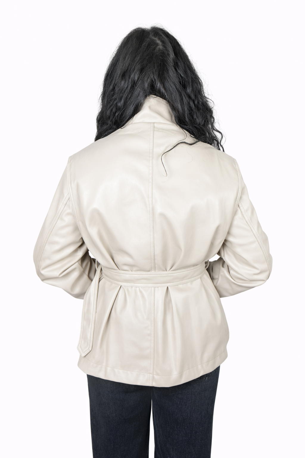 Elegantní dámská bunda z kvalitní koženky. Model je zapínaný na cvoky a doplněný o odnímatelný stojáčkový límec, díky kterému lze bundu snadno přizpůsobit různým outfitům. Pásek v pase umožňuje zvýraznit siluetu a dodat bundě ženský tvar, zatímco rovnější střih bez pásku působí ležérněji. Dekorativní kovové cvoky dodávají modelu jemně luxusní vzhled.