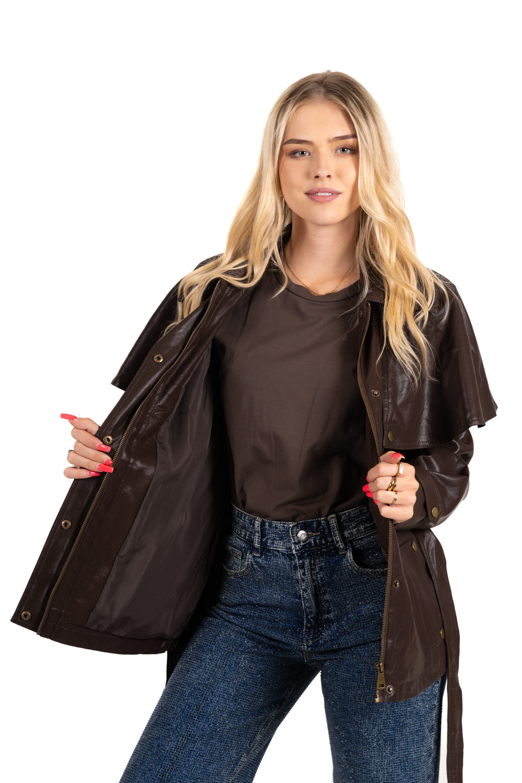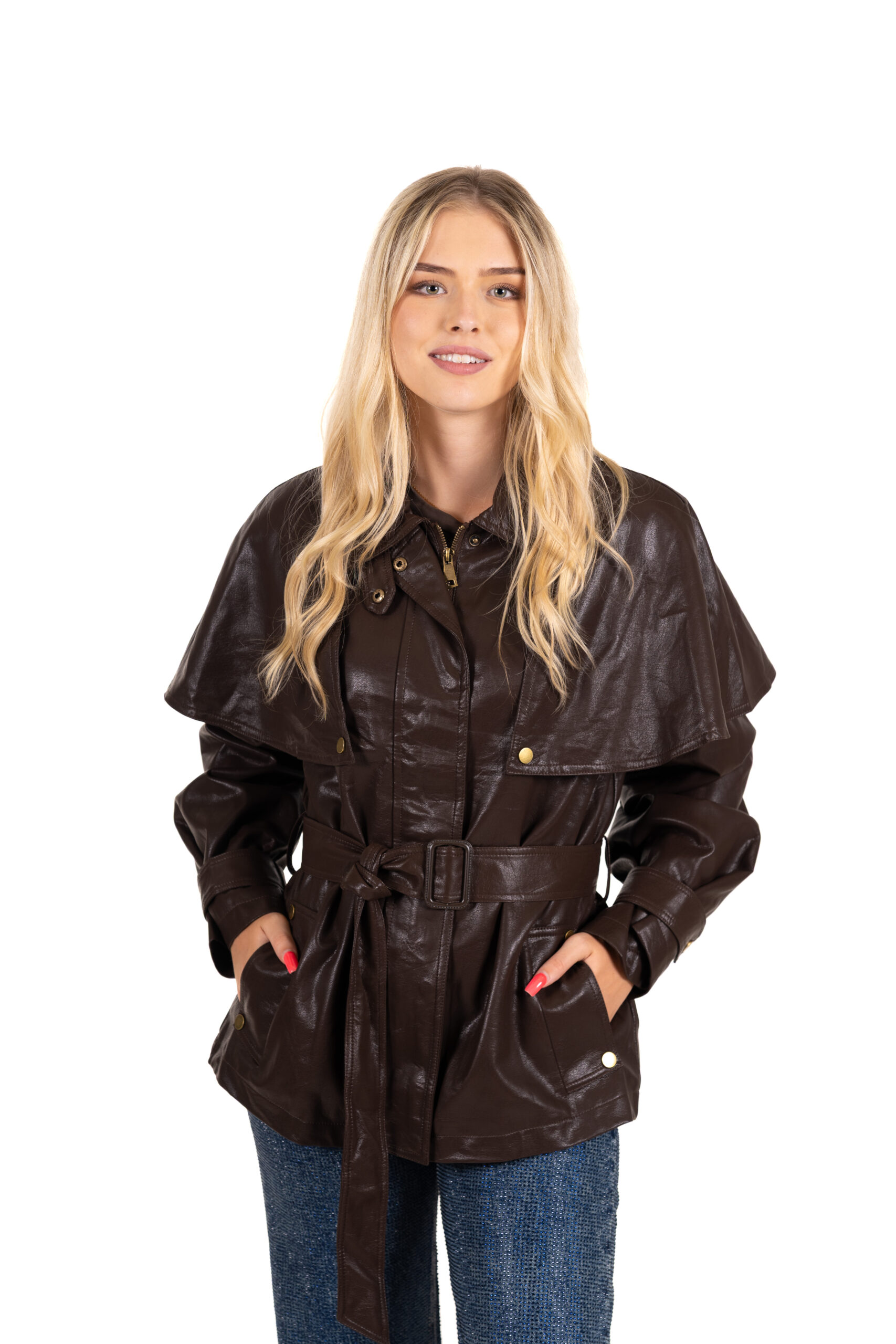 Dámská koženková bunda v tmavě hnědé barvě je stylovým kouskem, který zaujme. Je vyrobena z kvalitní koženky a pro větší pohodlí je opatřena podšívkou. Bunda se zapíná na praktický zip doplněný o cvoky, které dodávají elegantní vzhled i lepší fixaci. Výrazným prvkem je pásek se sponou, jenž zvýrazňuje siluetu a umožňuje přizpůsobit si obvod pasu. Širší klopa přes ramena lehce volnější střih dodávají bundě moderní i lehce retro nádech. Nechybí ani dvě boční kapse na cvok, které jsou stylové.