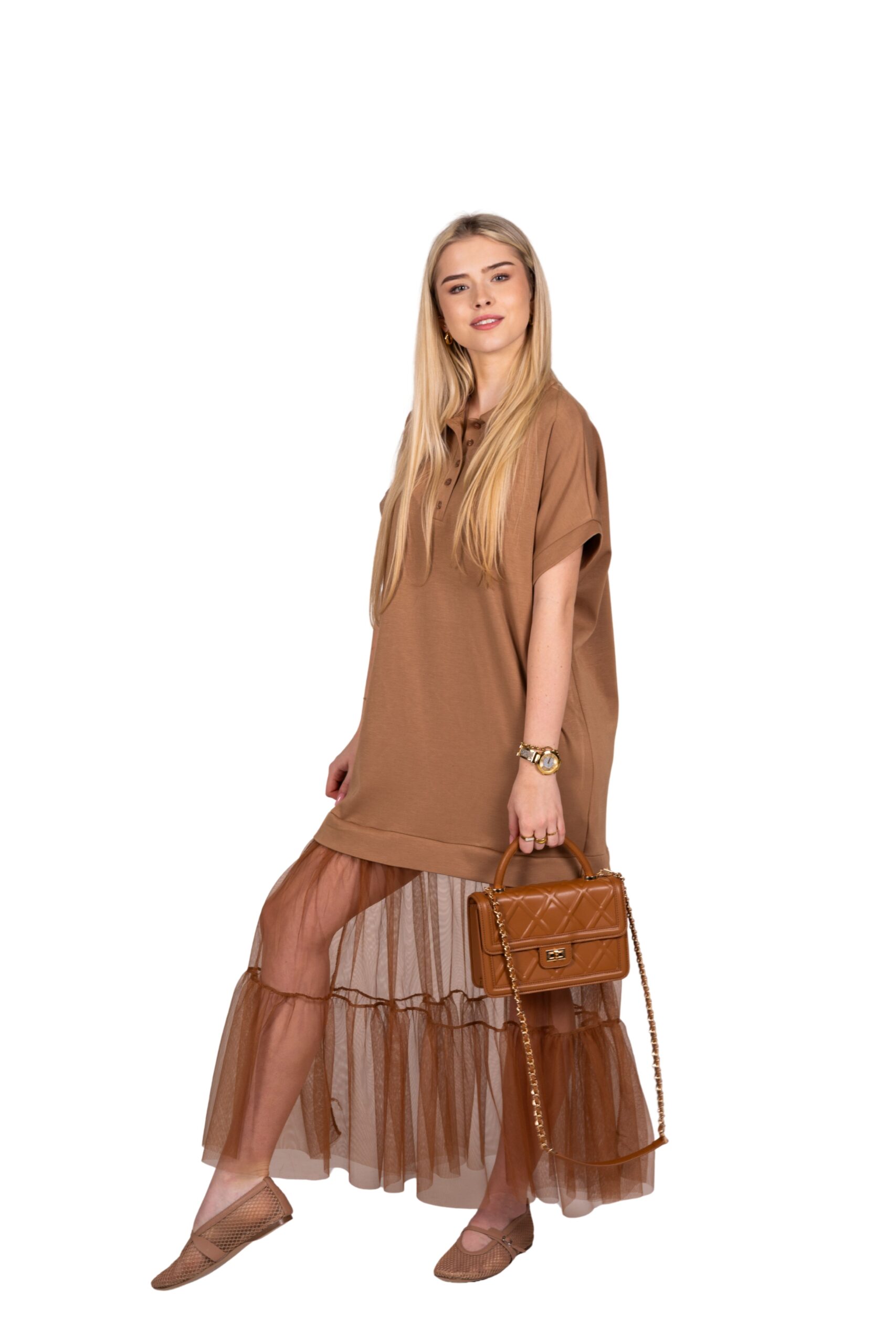 Originální volné šaty v moderním vrstveném stylu. Horní část působí jako pohodlné oversize tričko s krátkými rukávy a zapínáním na knoflíčky, spodní část tvoří lehká tylová sukně s volány, která dodává celému modelu ženskost a šmrnc.