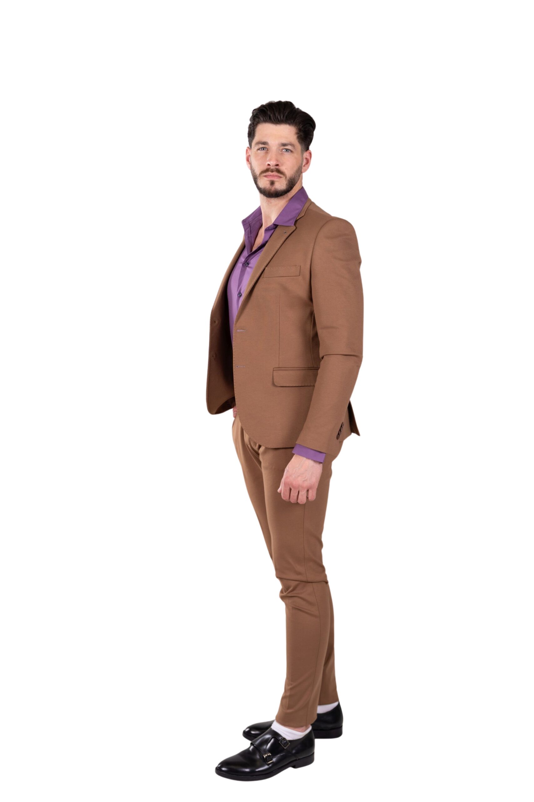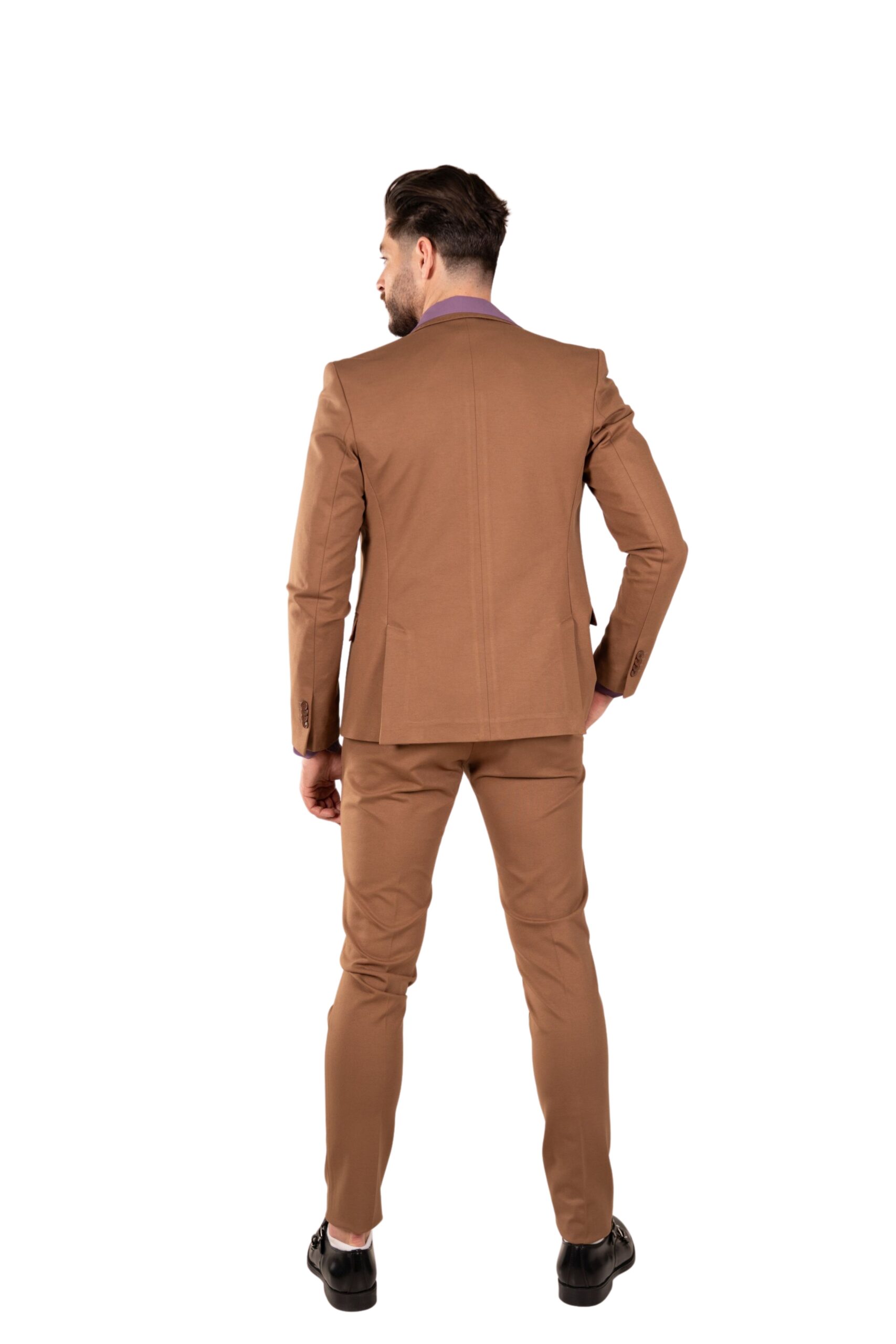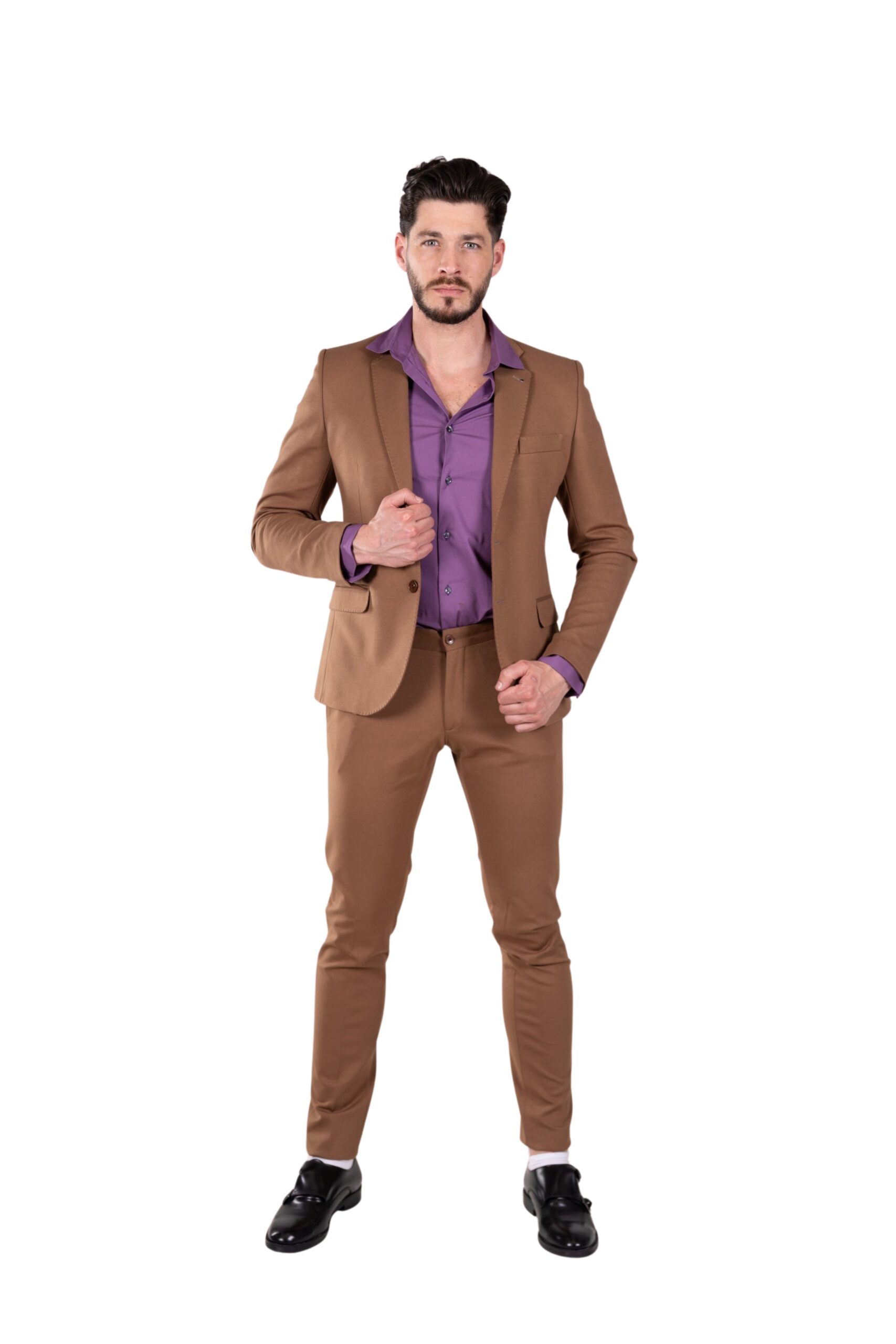 Elegantní oblek se dvěma zadními rozparky a vnitřní podšívkou. Sako je zdobené jemným prošitím na klopách, kapsách a kolem celého obvodu. Zapínání na dva knoflíky, které se opakují i na rukávech. Kalhoty klasického střihu, bez lemu (oentlované), vhodné pro formální i stylové příležitosti.