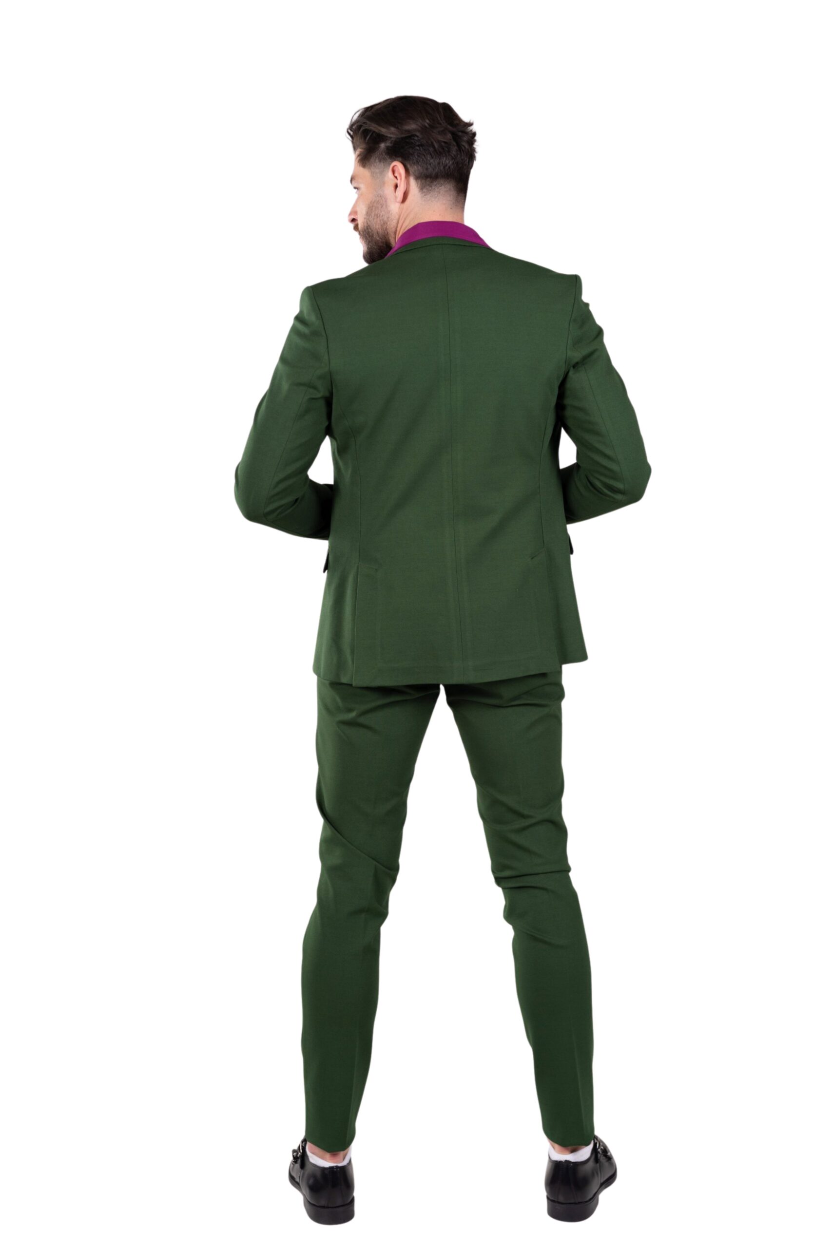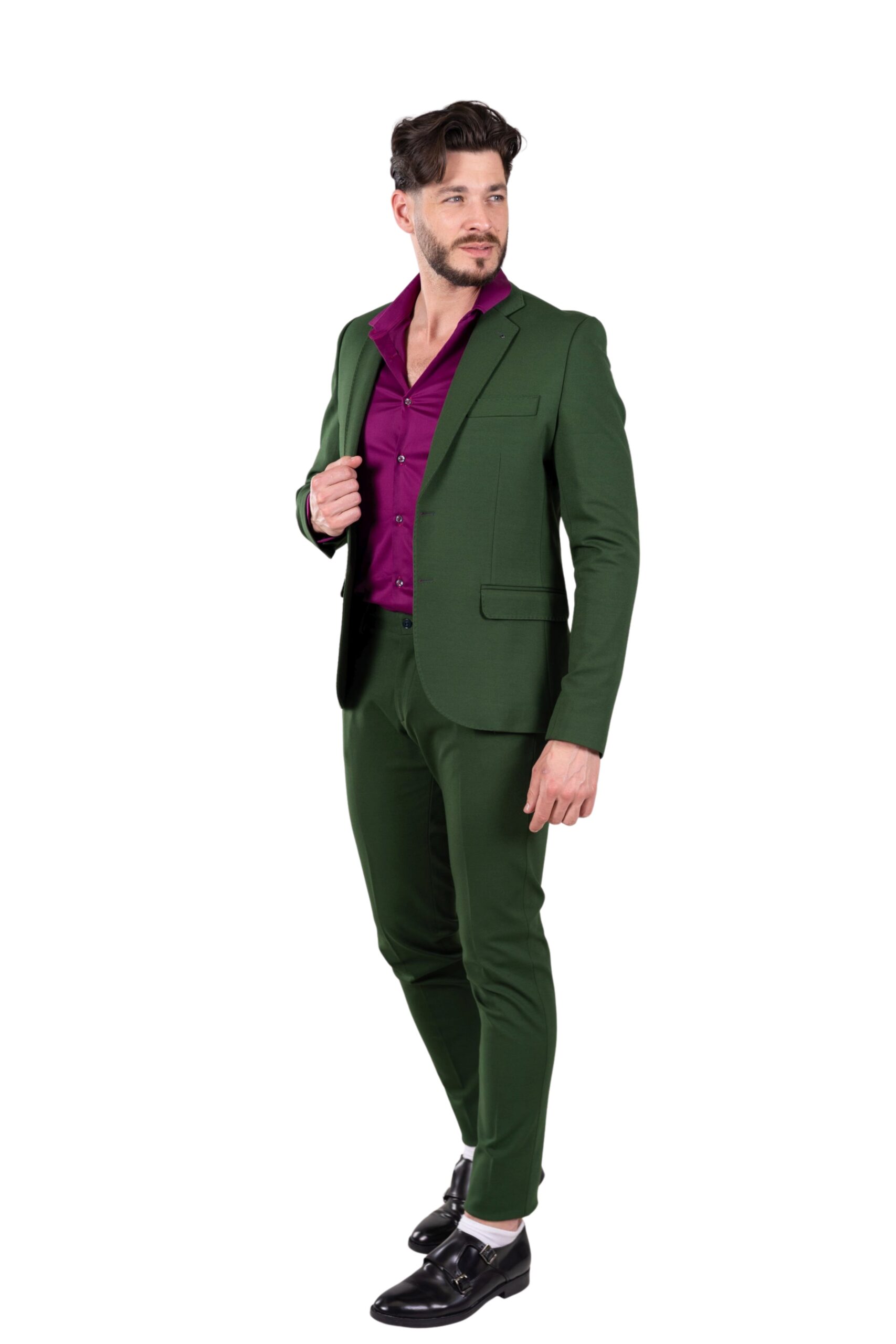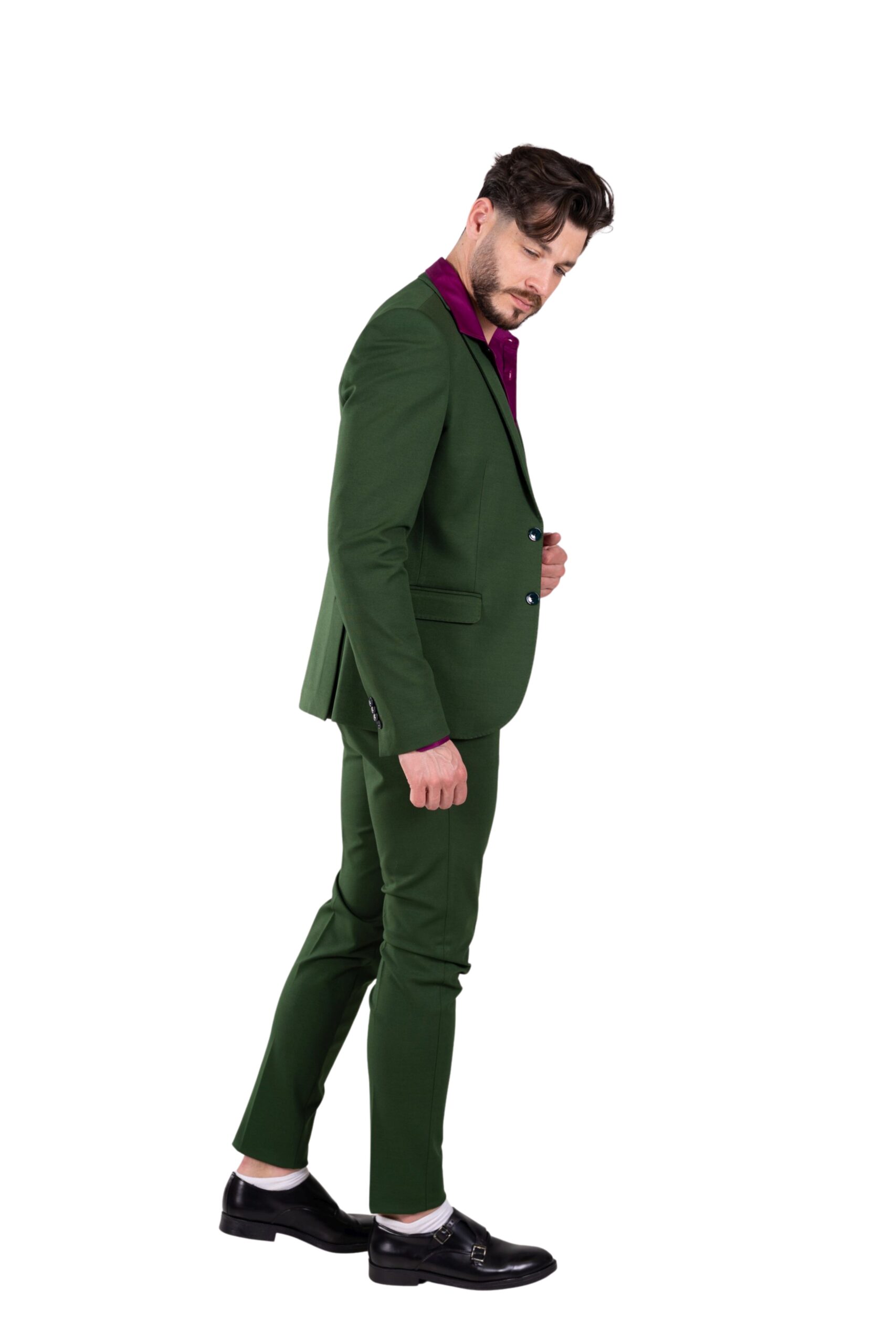 Elegantní oblek se dvěma zadními rozparky a vnitřní podšívkou. Sako je zdobené jemným prošitím na klopách, kapsách a kolem celého obvodu. Zapínání na dva knoflíky, které se opakují i na rukávech. Kalhoty klasického střihu, bez lemu (oentlované), vhodné pro formální i stylové příležitosti.