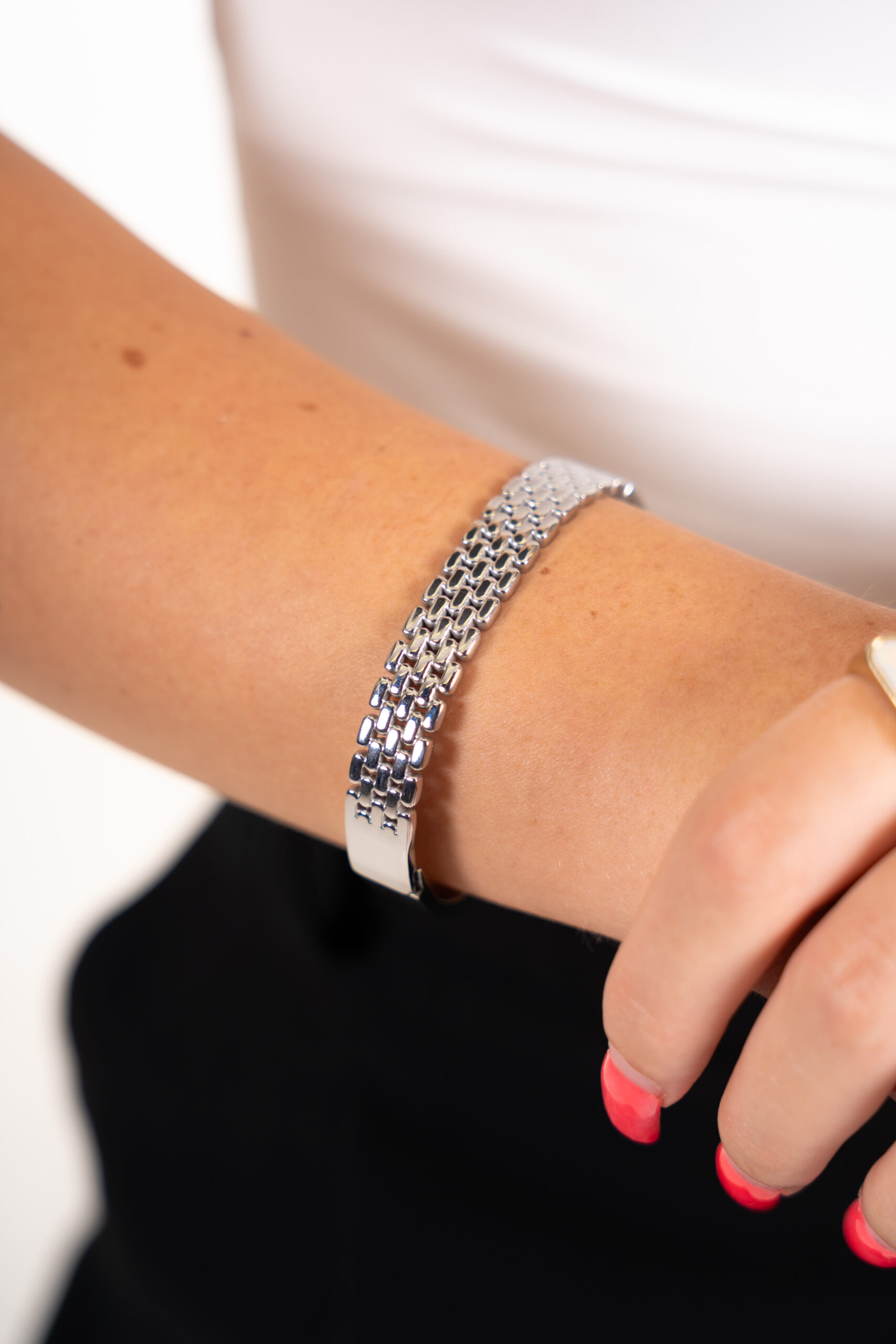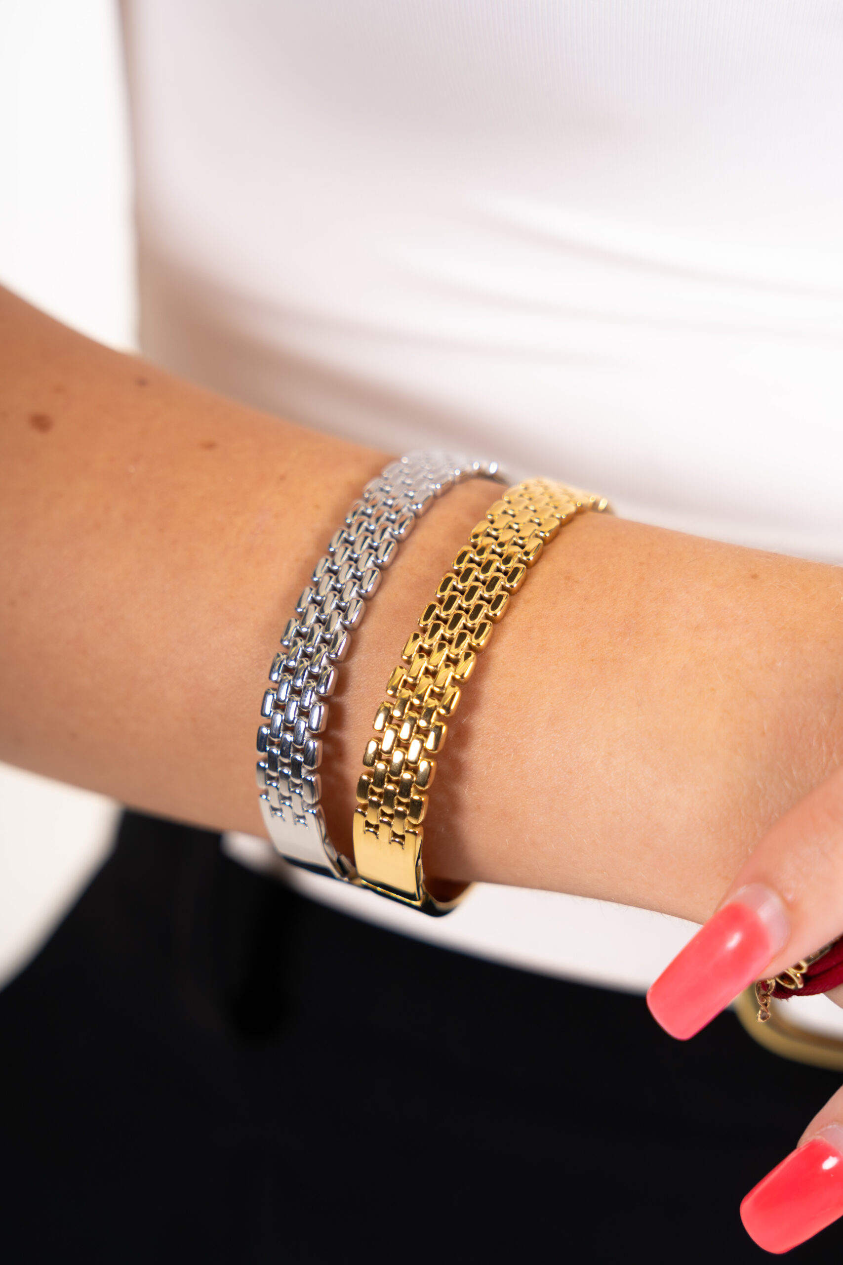 Pletený náramek v kombinaci stříbrného a zlatého provedení, který působí moderně a zároveň nadčasově. Díky svému decentnímu, ale výraznému designu se hodí jak k ležérnímu, tak i k elegantnímu outfitu. Skvělý doplněk pro každodenní nošení i speciální příležitostí.