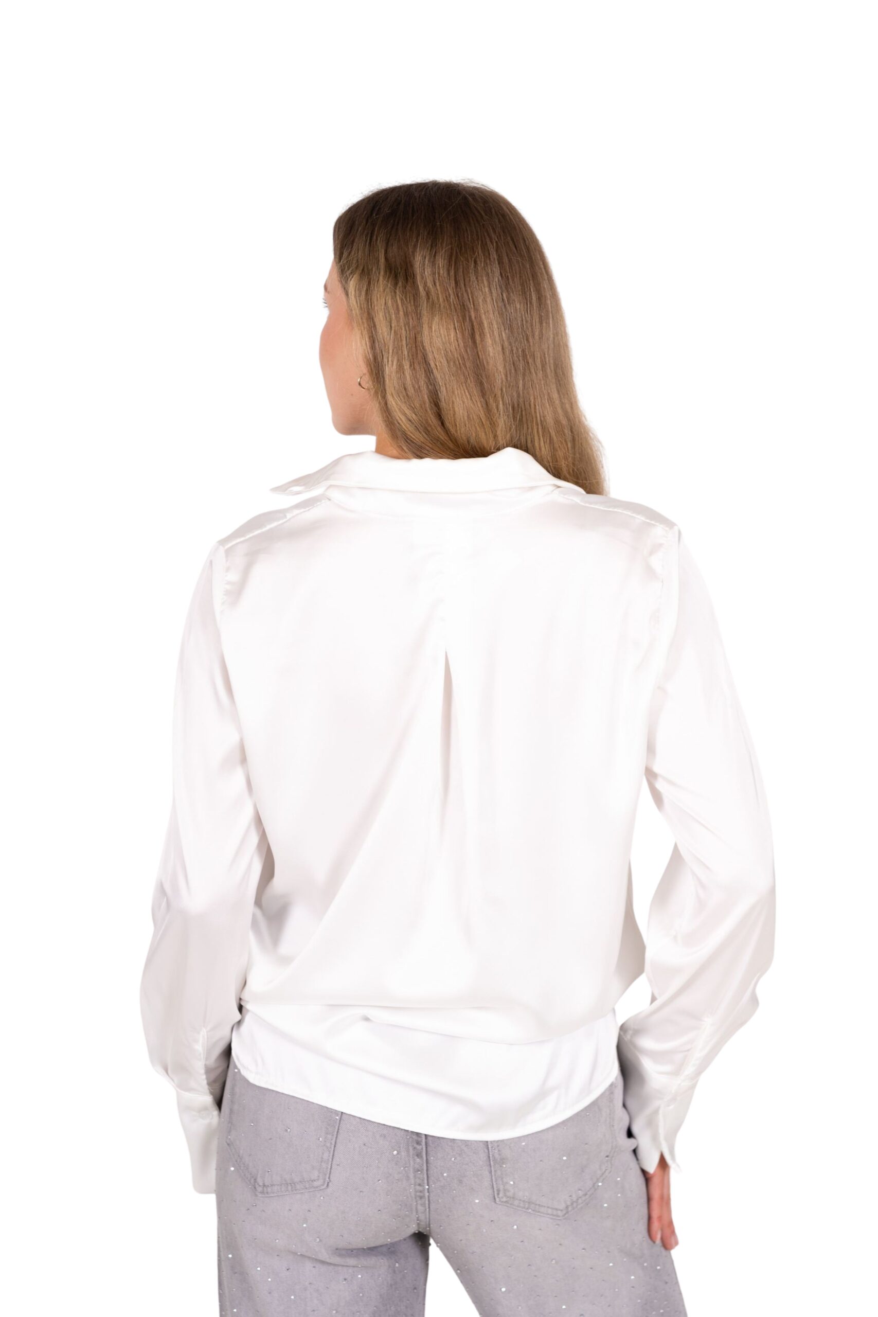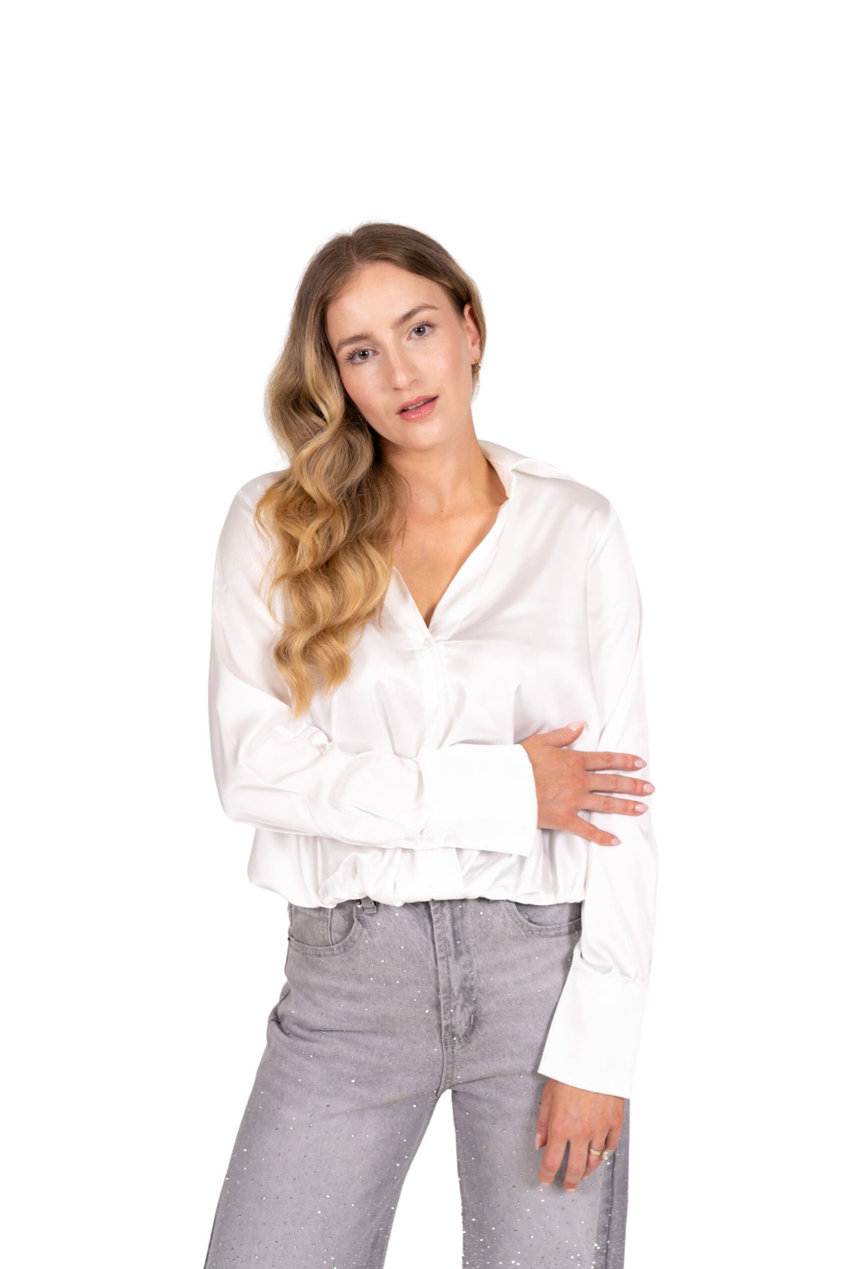 Elegantní saténová košile v klasickém bílé a černé barvě s jemným leskem. Přední část je zakončená pružným lemem s gumou, který se krásně přizpůsobí postavě, zatímco zadní díl zůstává volný a splývavý. Má prodloužené manžety na univerzální kousek vhodný pro každodenní i elegantní outfit.
