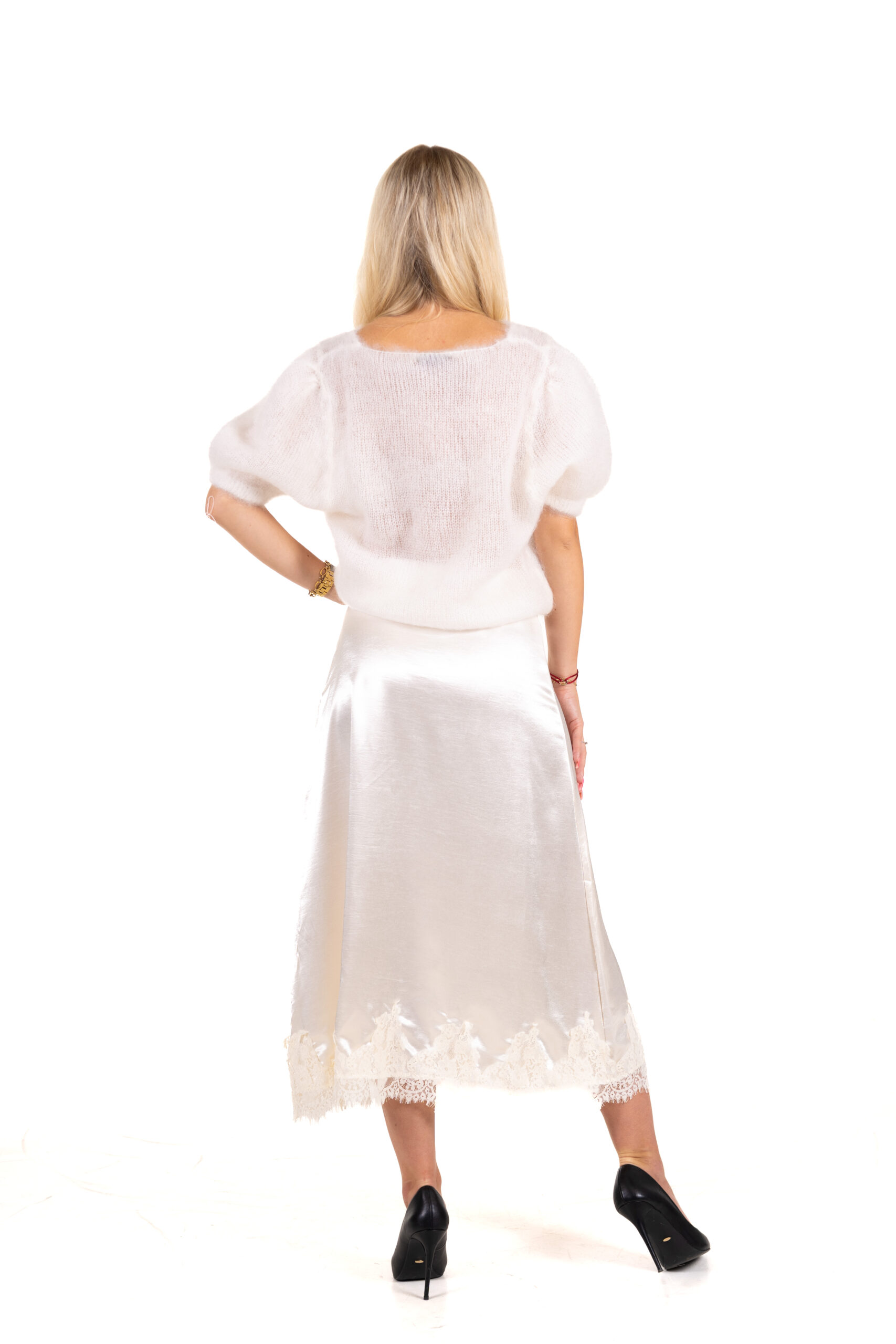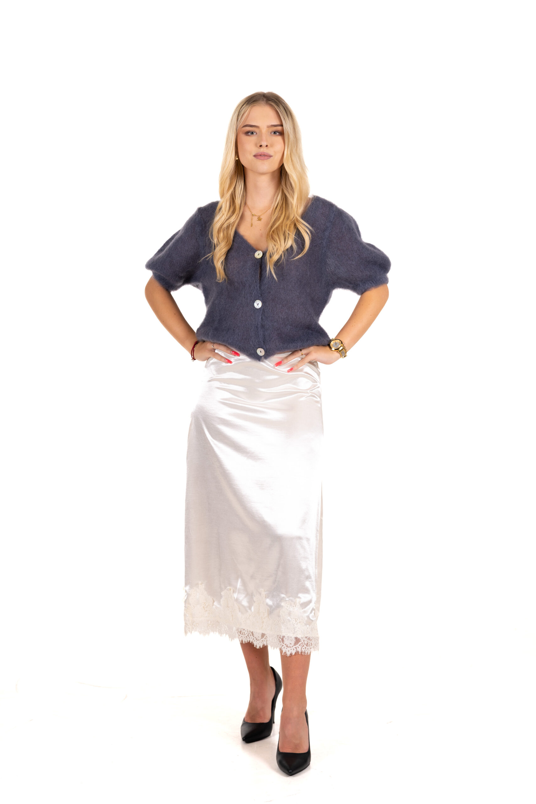 Elegantní saténová sukně s jemným leskem a krajkovým lemem ve spodní části. Sukně má klasický střih, není elastická a zapíná se na boku na zip. Díky svému sofistikovanému vzhledu je ideální volbou pro společenské příležitosti i elegantní denní outfity.
