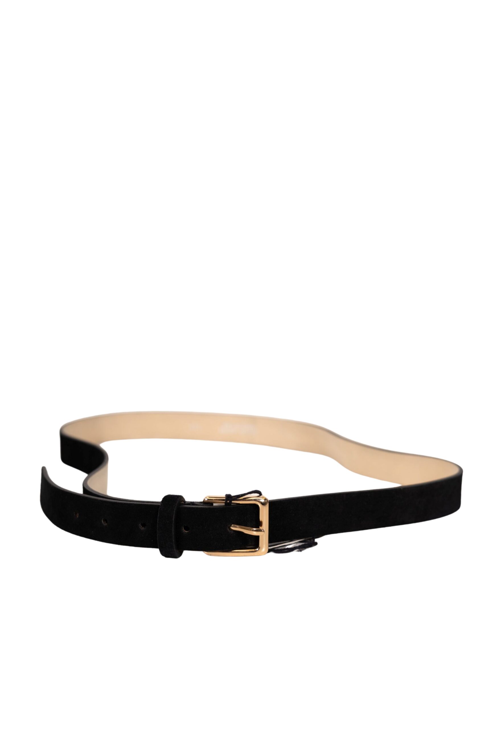 Černá kožený pásek se semišovým povrchem a zlatou sponou.