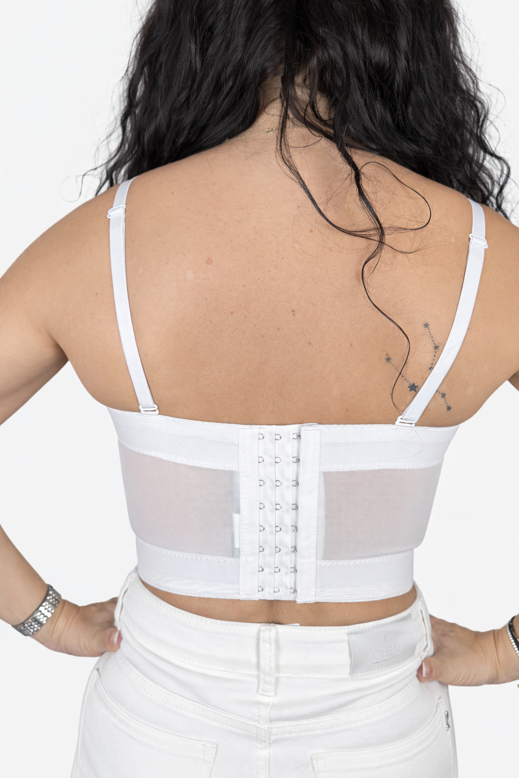 Smyslný a dokonale tvarující korzetový top, který zvýrazňuje ženskou siluetu a dodává outfitu výrazný, ale stále elegantní charakter. Pevně vystužené push-up košíčky krásně formují dekolt a poskytují spolehlivou oporu. Korzetové švy opticky zeštíhlují postavu. Zadní zapínání je řešeno čtyřřadým háčkovým zapínáním s možností nastavení obvodu pro maximální pohodlí. Ramínka jsou nastavitelná a plně odnímatelná.