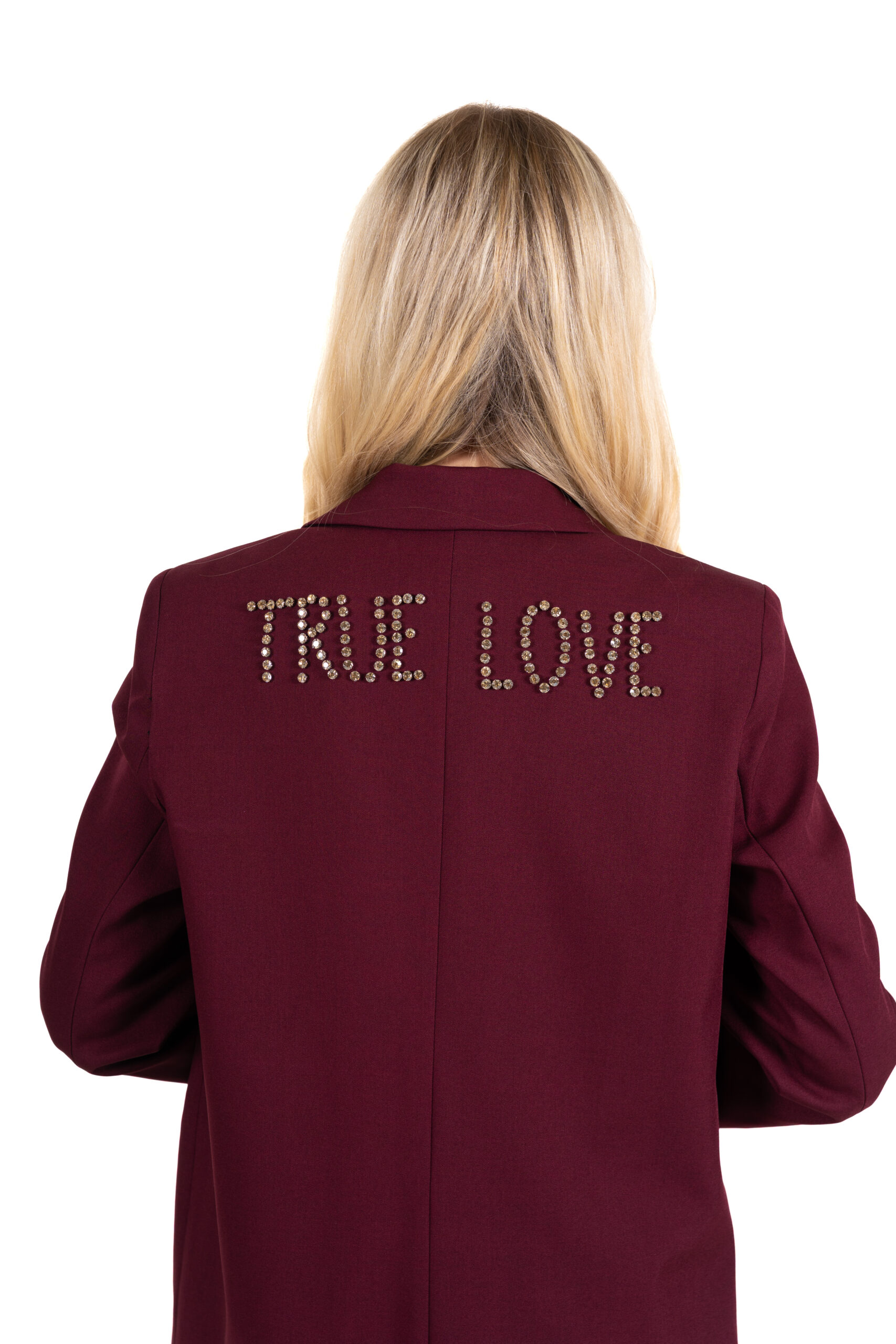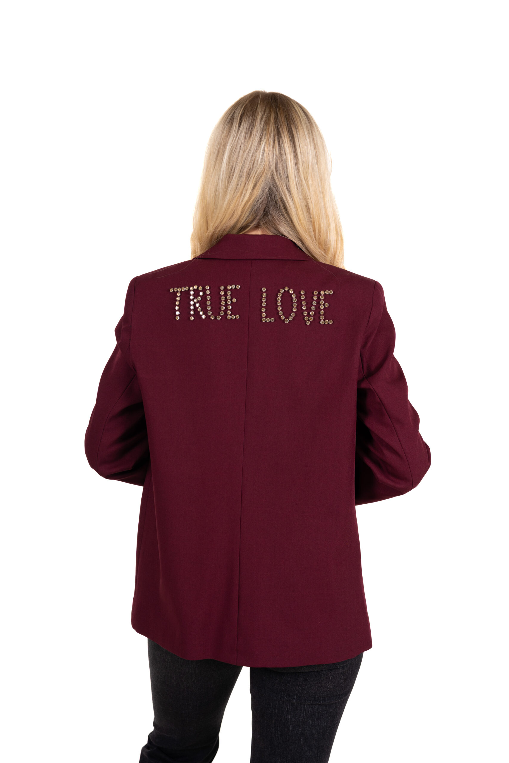 Elegantní dámské sako v hluboké vínové barvě s klasickým střihem, které ozvláštní každý otfit. Přední část zdobí jeden zapínací knoflík a decentní falešné kapsy, které podtrhují čistý design. Vnitřní podšívka zajišťuje pohodlné nošení. Na zadní straně je originální detail – kamínkový nápis TRUE LOVE, který dodává modelu odvážný a stylový vzhled. Perfektní volba jak k džínům pro ležérní outfit, tak i k elegantním kalhotám nebo sukni.