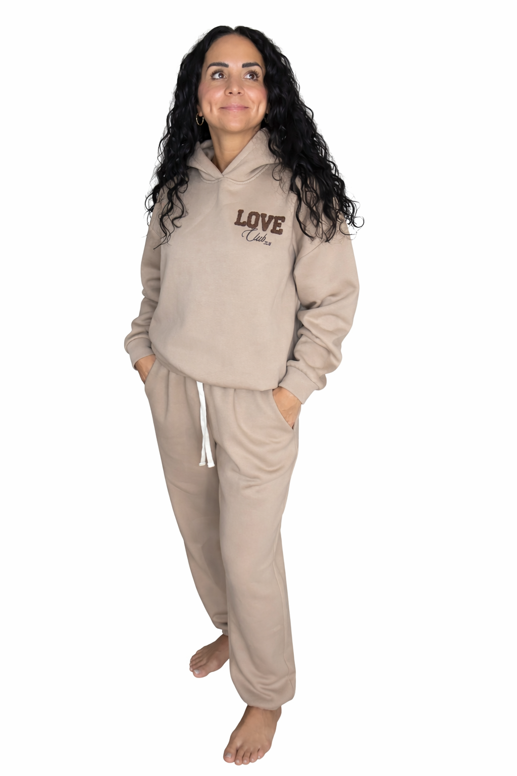 Stylová a maximálně pohodlná oversize tepláková souprava, ve které budete vypadat uvolněně, ale stále upraveně. Set tvoří měkká mikina s kapucí a potiskem LOVE Club na přední i zadní straně, spolu s ladícími tepláky do gumy s praktickou stahovací šňůrkou v pase. Na bocích najdete prostorné kapsy, které oceníte při každodenním nošení. Mikina má volný, příjemně široký střih, který neomezuje pohyb a kapuce poskytuje pohodlí i styl. Tepláky jsou elastické v pase, příjemně měkké na těle a zakončené klasickými nohavicemi, které se dobře kombinují se sportovní obuví.